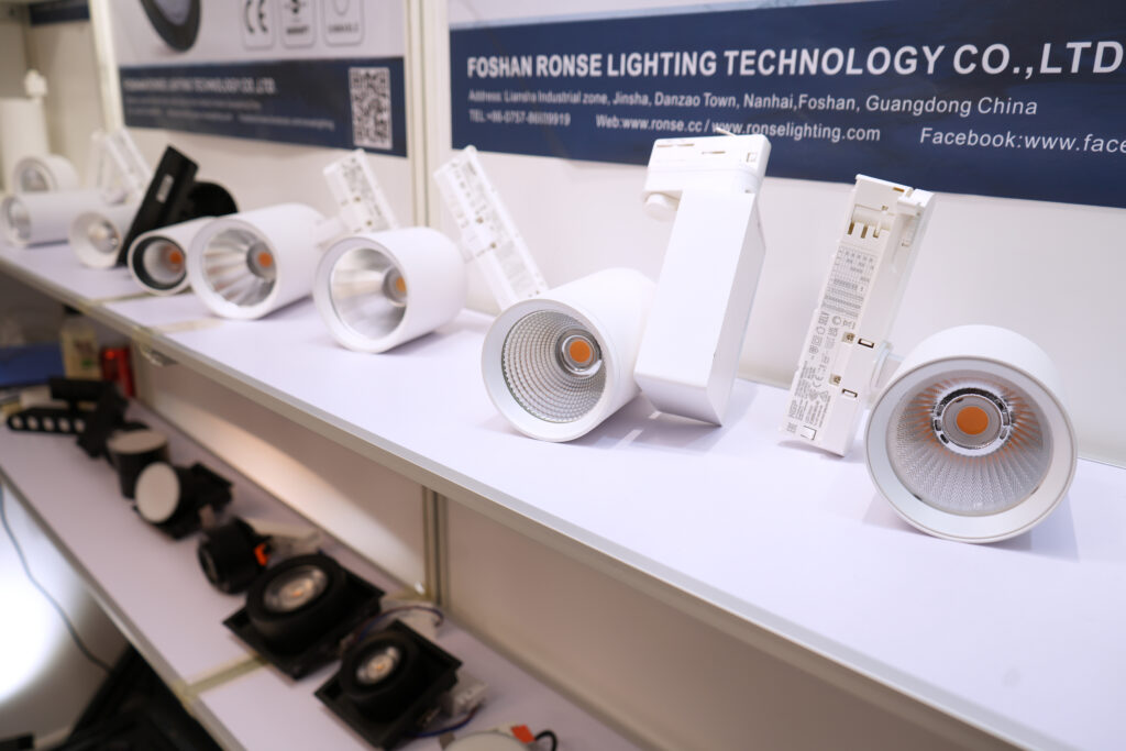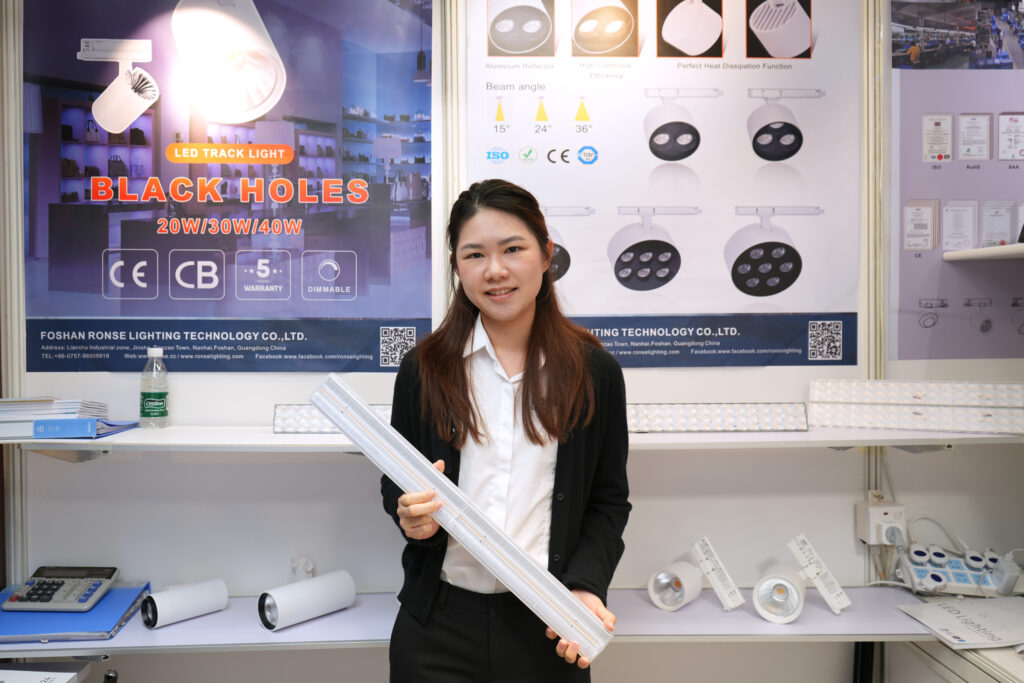 展会期间,我们采访了多家使用「贸发网采购」平台,积极推广主打商品的参展商。其中佛山市荣仕照明科技有限公司主推LED轨道灯和筒灯,其出口总监Sunny介绍,公司灯具主要商用于超市和仓库,线性照明能根据照射物自动调节色温:例如为蔬菜投射绿光,为苹果切换红光。