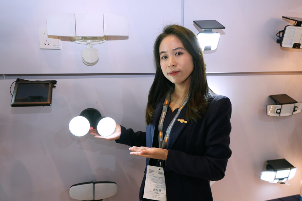 另一家吸引我们关注的企业是主营太阳能灯具产品的耀邦新能源科学工业有限公司。其销售主管Landy Jiang重点介绍了其销售产品的智能感应功能:当检测到人员离开时灯具会自动熄灭,大幅节省能耗。