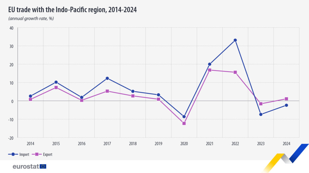 欧盟统计局(Eurostat)数据显示,2024年欧盟与印太地区的贸易总额达8480亿欧元。其中进口额为4503亿欧元,出口额为3977亿欧元。与2023年相比,进口下降2.4%,但出口增长1.1%。印太地区占欧盟总进口额的18.5%和总出口额的15.4%,这印证了印太地区现已成为欧盟的重要贸易伙伴。