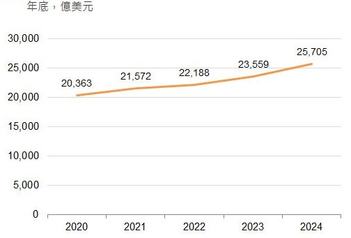 - 根据香港政府的调查数据,截至2024年底,香港吸纳的外来直接投资存量估计为25705亿美元,按年上升1%。2024年,香港的直接投资总流入为1259亿美元,按年上升2.9%;