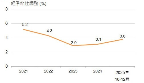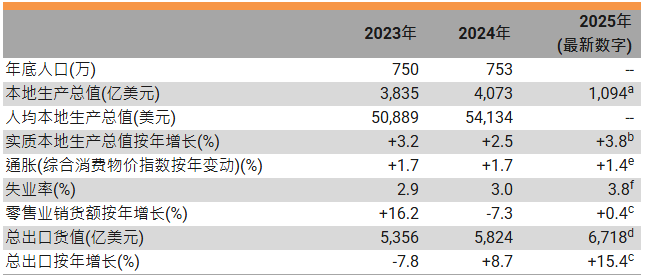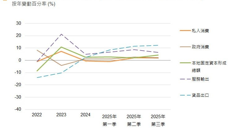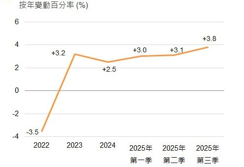 - 香港经济于2025年第三季表现蓬勃,主要受益于出口表现强劲及本地需求改善,实质本地生产总值按年增加8%。香港特别行政区政府对2025年全年香港GDP实质增长由2%-3%向上调整至3.2%;
