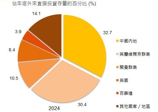 - 中国内地及英属维尔京群岛是香港两个最大的外来直接投资来源地,分别占2024年年底外来直接投资存量的7%及30.4%;