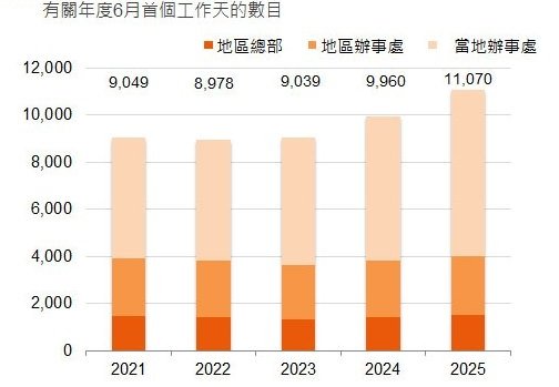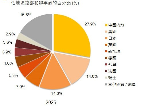 - 2025年,母公司在海外及内地的驻港公司数目较2024年增加超过1100间,至10070间。按母公司所在地分析,内地驻港公司数目最多(3090间),其次为美国(1550间)、 日本(1550间)、英国(770间)及新加坡(590间)。