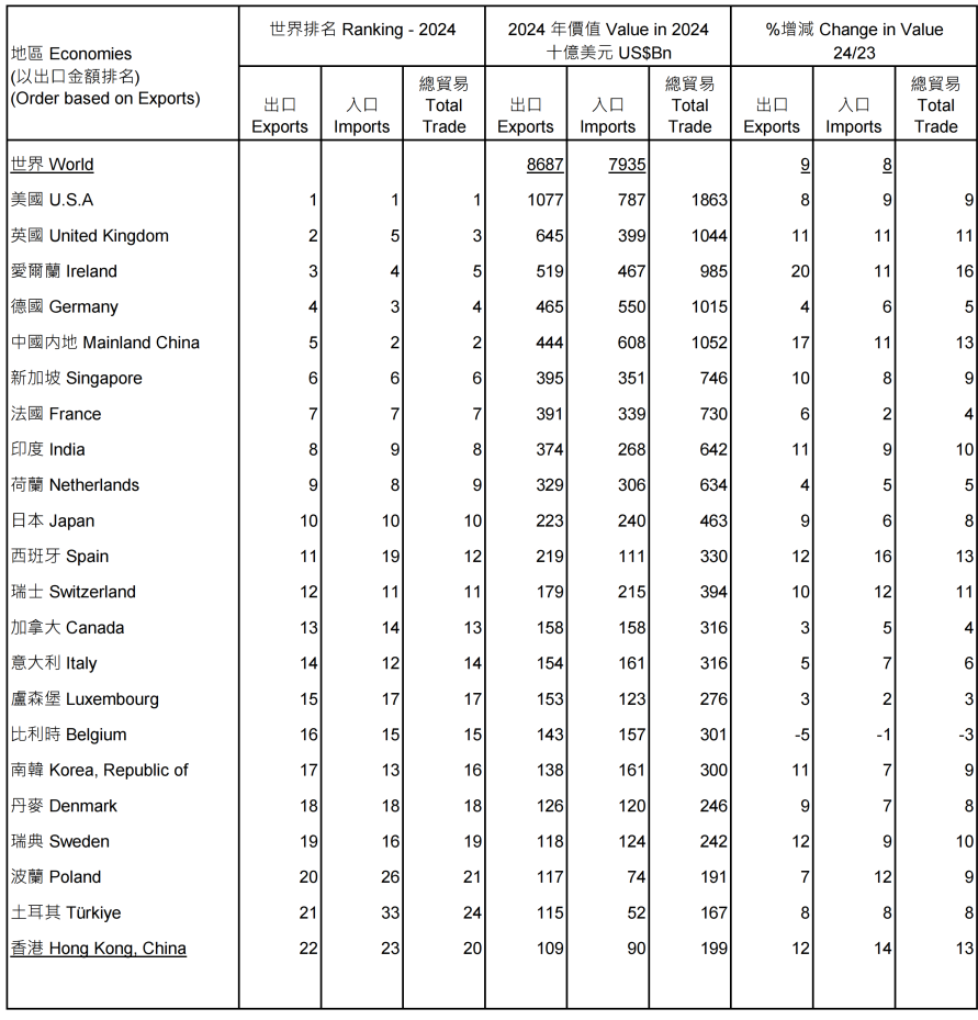 - 根据世界贸易组织,2024年,香港是全球第八大商品输出地;