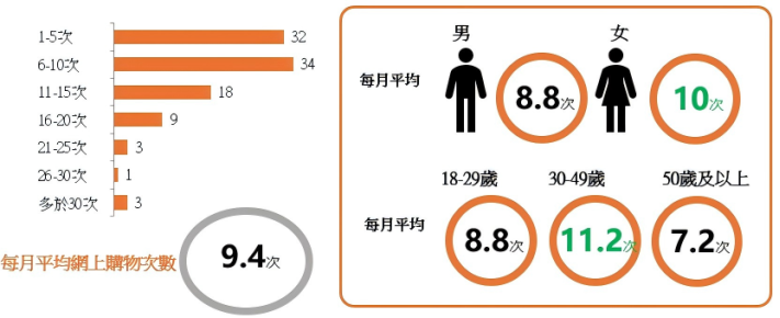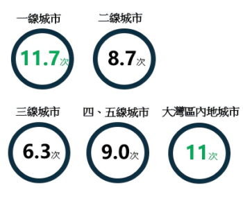 内地消费者网购频繁:平均每月网购4次,尤以一线(平均每月11.7次)及大湾区城市(平均每月11次)为然;其中,女性(10次)网购频率高于男性(8.8次);以年龄划分,则30-49岁消费者的网购频率最高,平均每月11.2次;