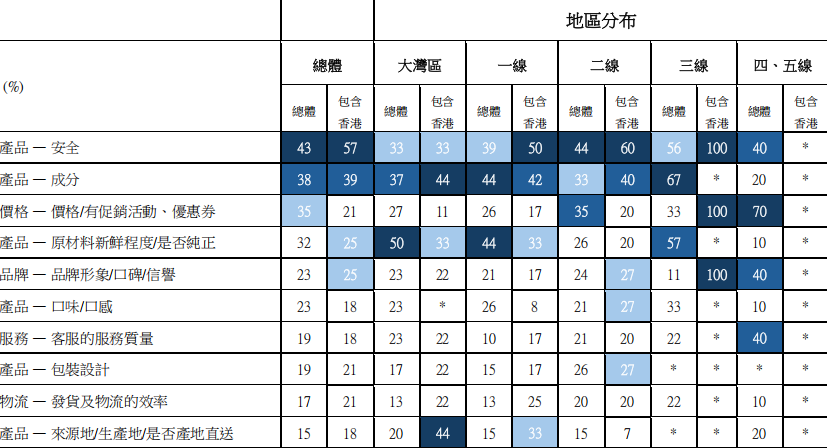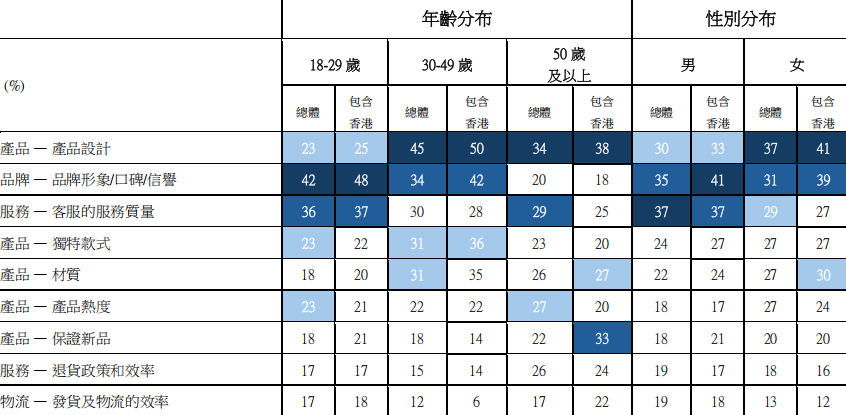 内地消费者网购香港产品,最重视品牌形象、产品品质/安全和功能:例如,内地消费者网购香港奢侈品(40%)、运动产品(37%)和时尚产品(61%)时,最重视品牌形象;网购香港美妆产品(41%)时,最重视产品质地;香港药品、保健品(42%)时,最重视产品功效;网购香港的消费电子及电器产品时最重视价格/促销;