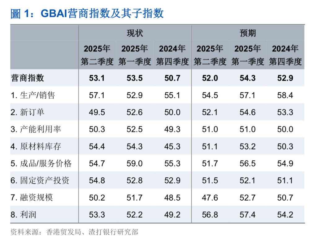 香港贸易发展局(香港贸发局)与渣打银行(香港)有限公司合作,对粤港澳大湾区(大湾区)的1000多家公司展开季度调查,由此获得的渣打大湾区营商景气指数(GBAI)显示,在美国「解放日」关税政策公布后的一个多月,当前业务表现仍具韧性。具体表现为:反映短期业务势头的整体现状指数在第二季度为53.1,与第一季度的53.5相近。「生产/销售」子指数的改善是主要亮点,证明企业面对飘忽的关税政策,纷纷提前下单及生产。然而,从预期指数来看,企业对下半年的展望较为审慎。整体预期指数由第一季度的54.3降至52.0,创10个季度新低。8个预期子指数有7个下降,1个持平,反映大湾区企业将要面临更多挑战。