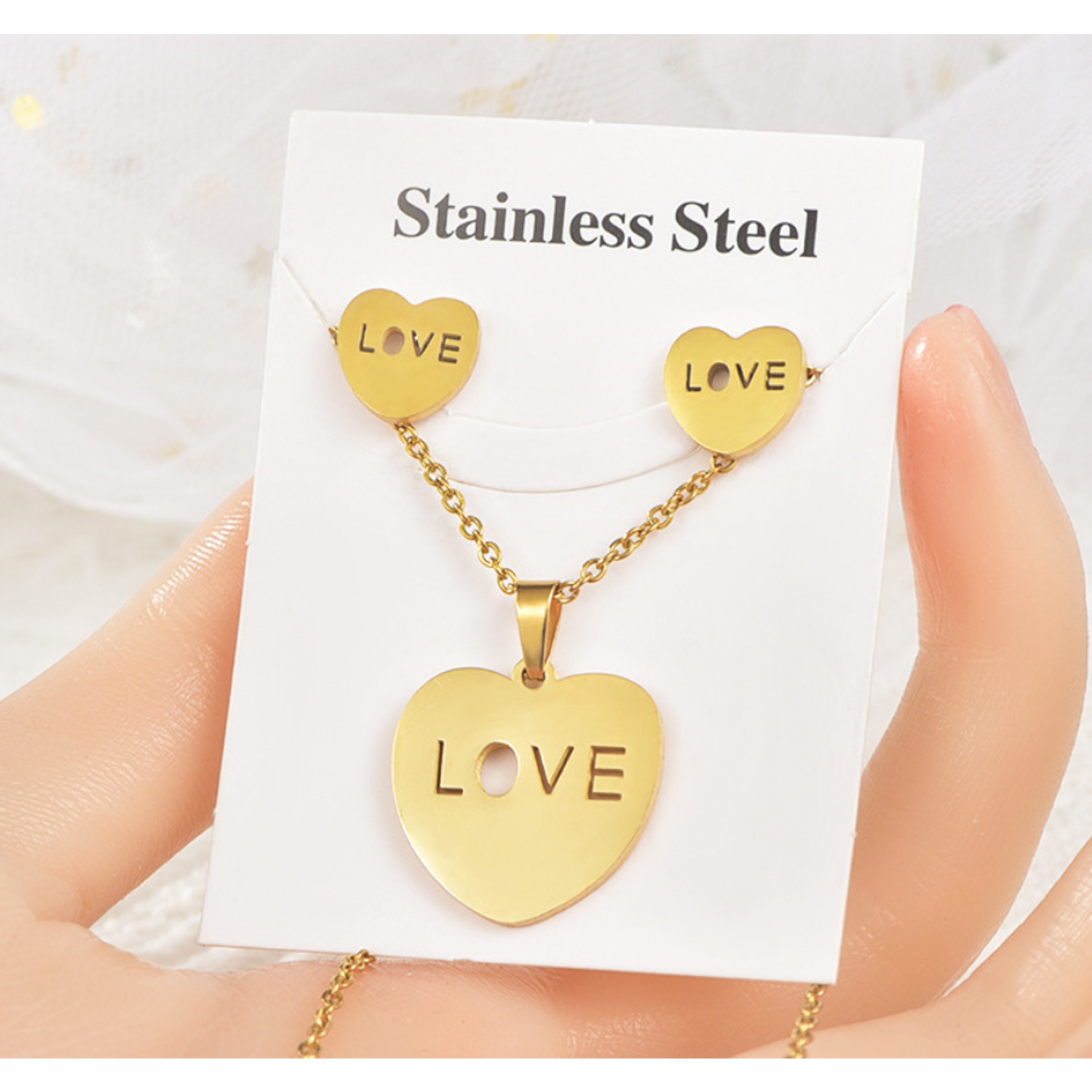18K Gold Plated Stainless Steel heart shape Necklace Earrings Set