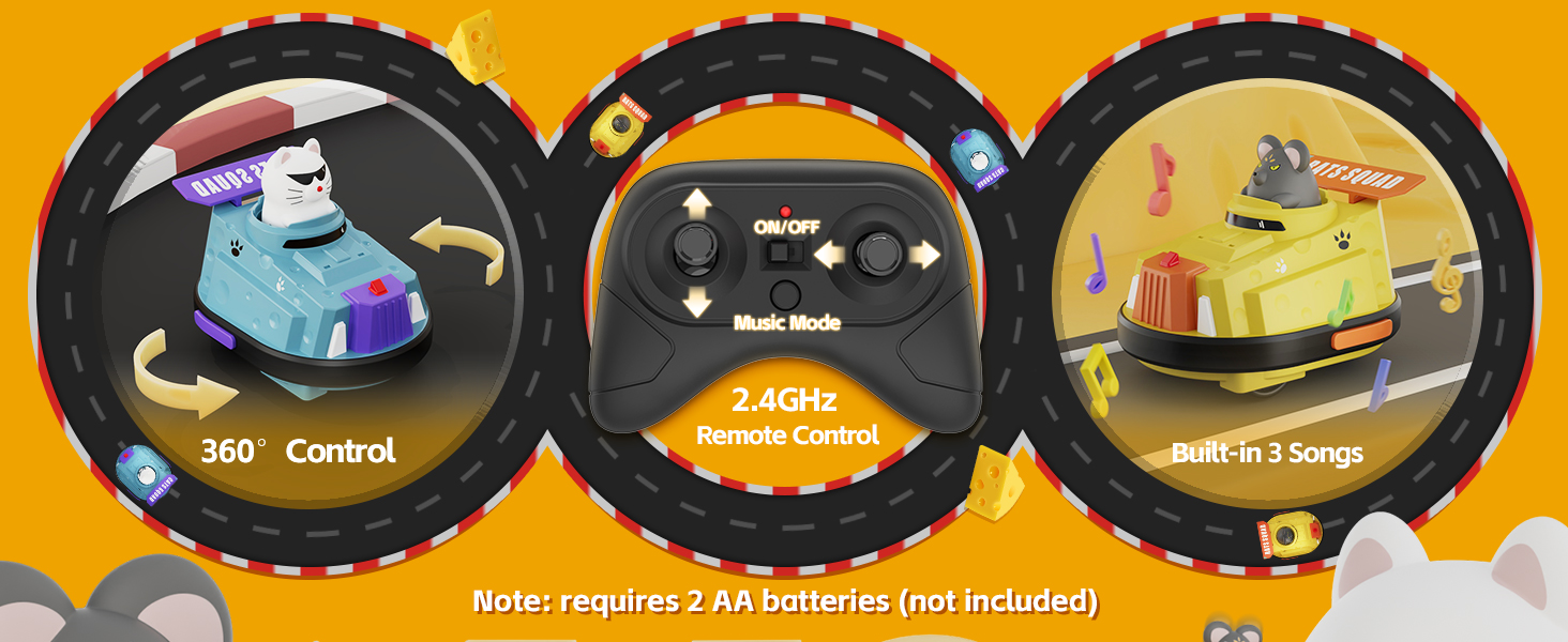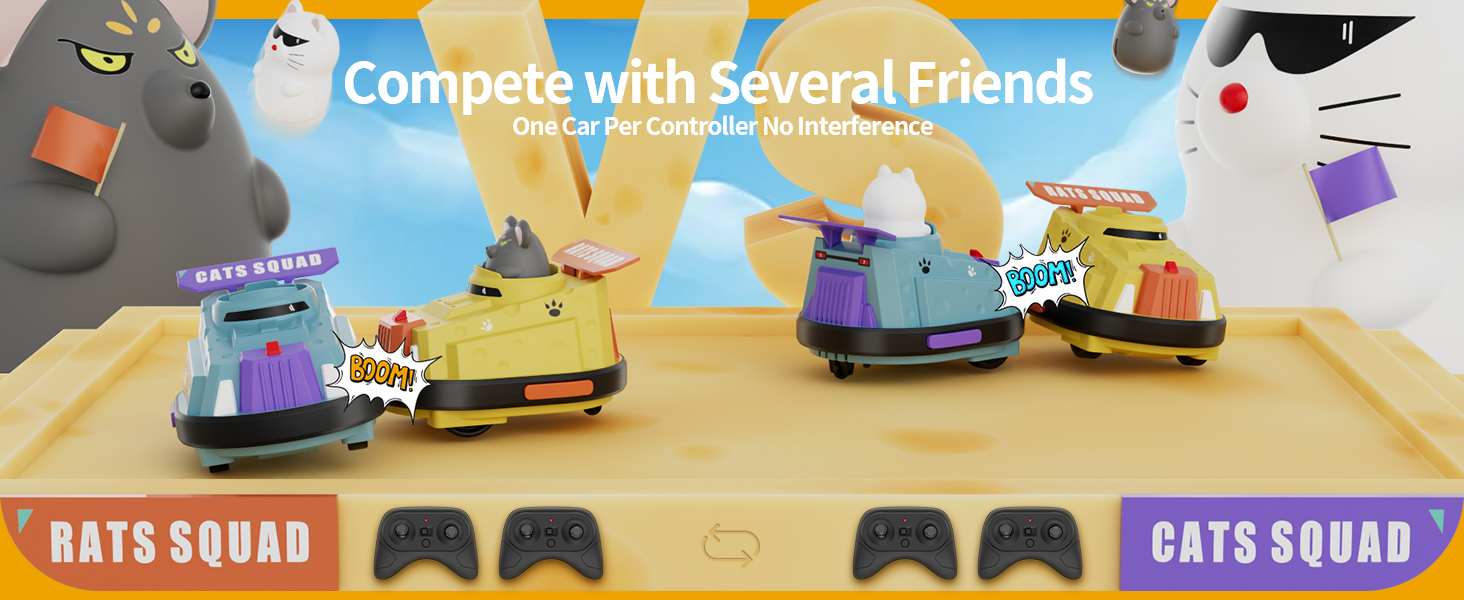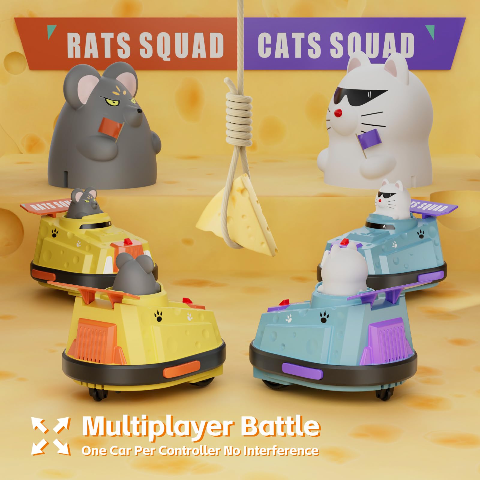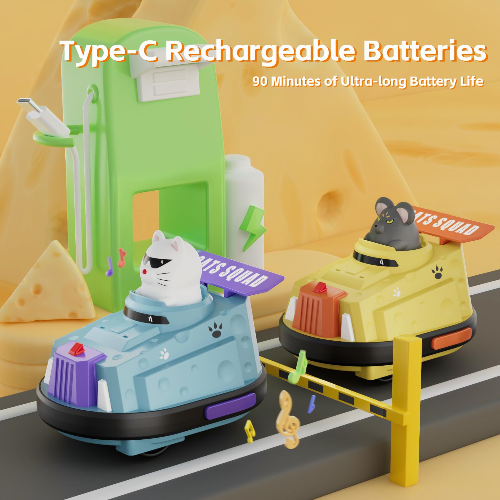 【Perfect Gifts for Kids & Adults】Our 2-pack of remote control bumper cars is the perfect gift for birthdays, holidays, Children's Day, Christmas, and New Year celebrations. Featuring a novel collision play style infused with a fun cat-and-mouse cheese theme, it delights children aged 6 and up, as well as adults.