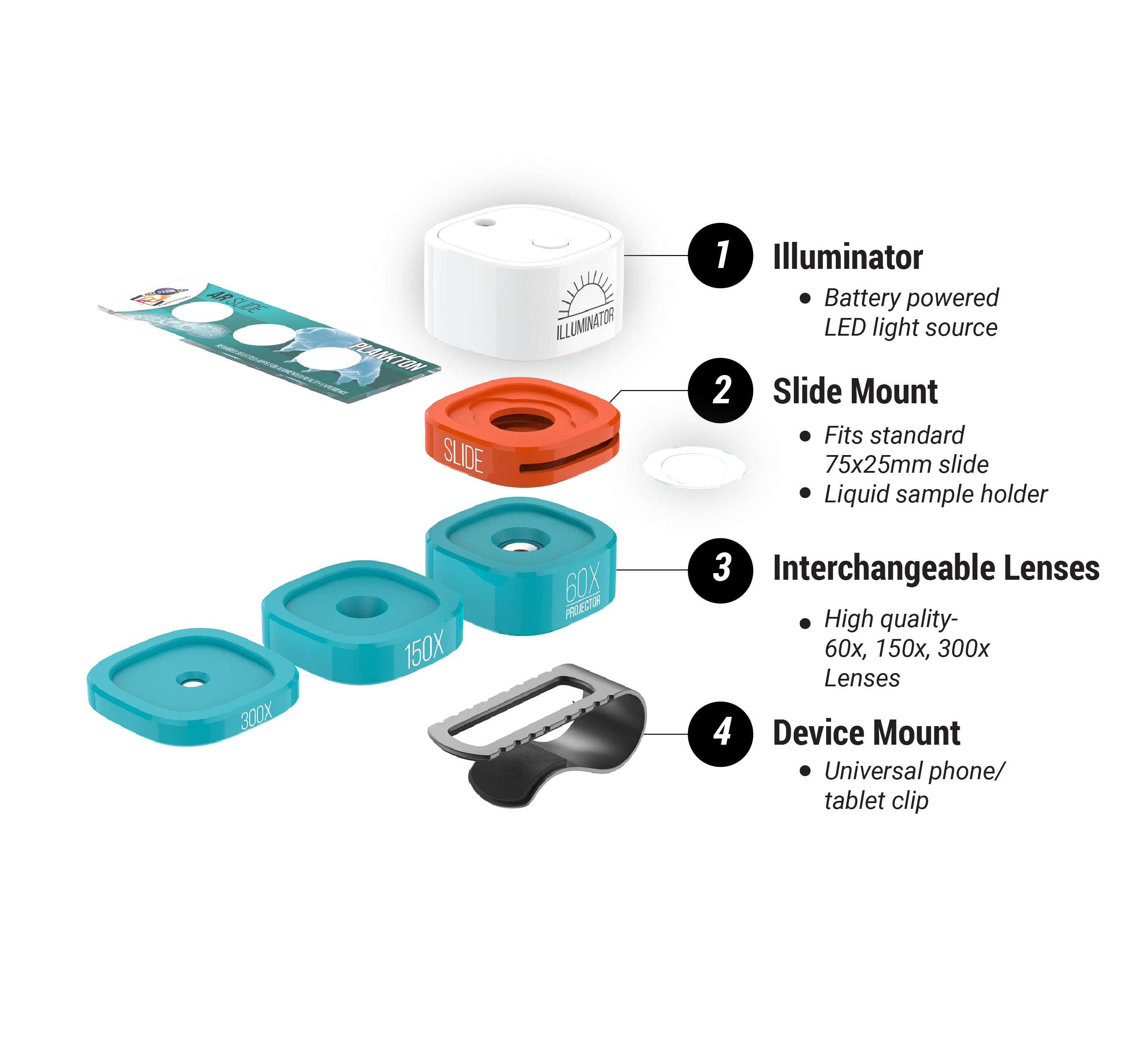 • Versatile range of 60X, 150X and 300X high quality lenses optimized for mobile devices. Use your phone/ tablet screen as a viewfinder for an impactful viewing experience
