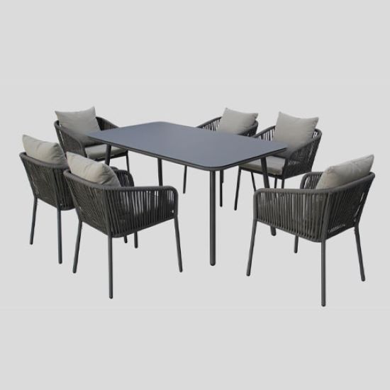 Dining set : Alu frame with power With Flat rope weaving With spun polyester seat and back cushion With 5mm printing for table top Chair size: 57.5*63*76.5 cm Table size: 160*90*75.5 cm