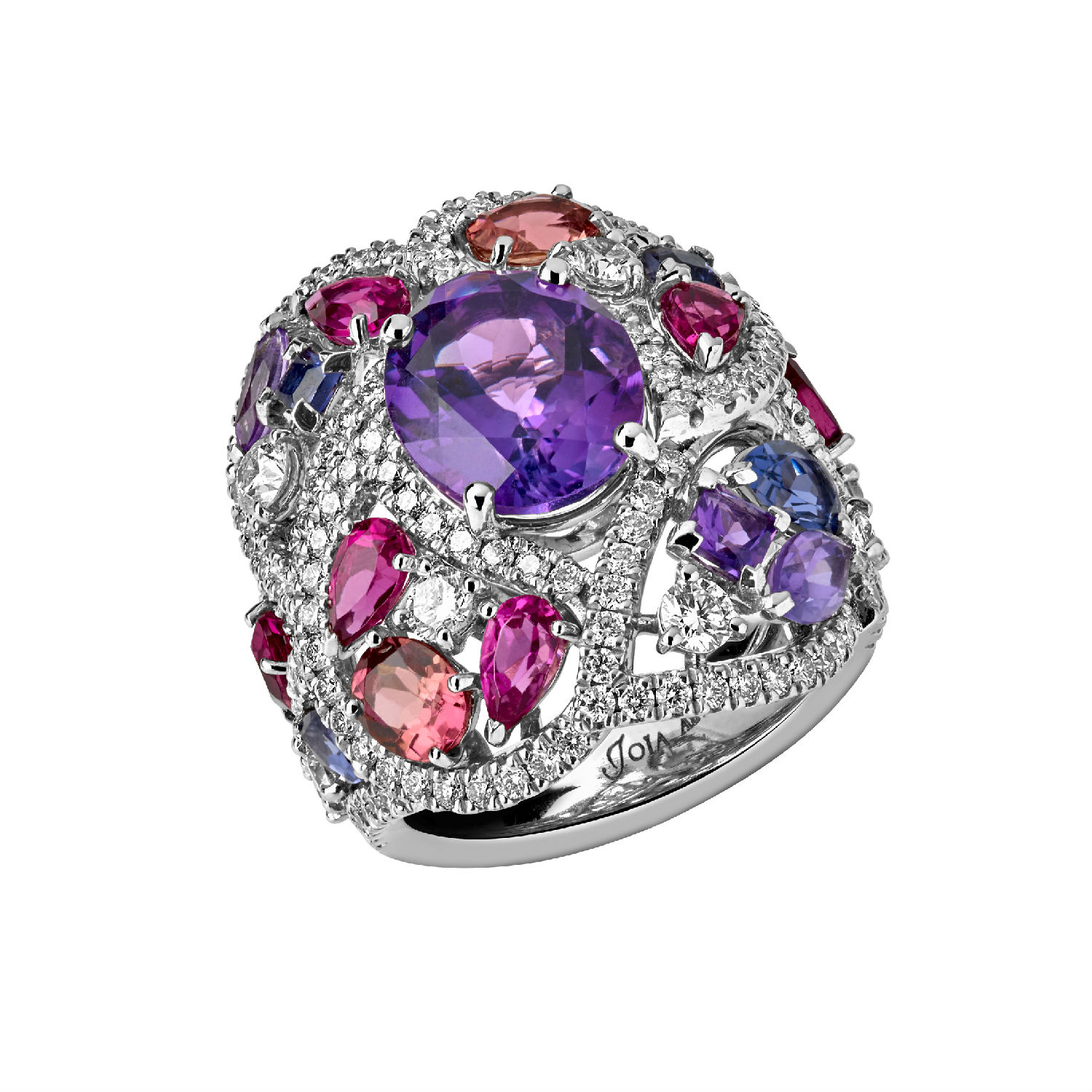 Amethyst (4.10 ct), Pink Tourmaline (2.06 ct), Iolite (1.21 ct) and Diamonds (1,91 ct) Ring, White Gold