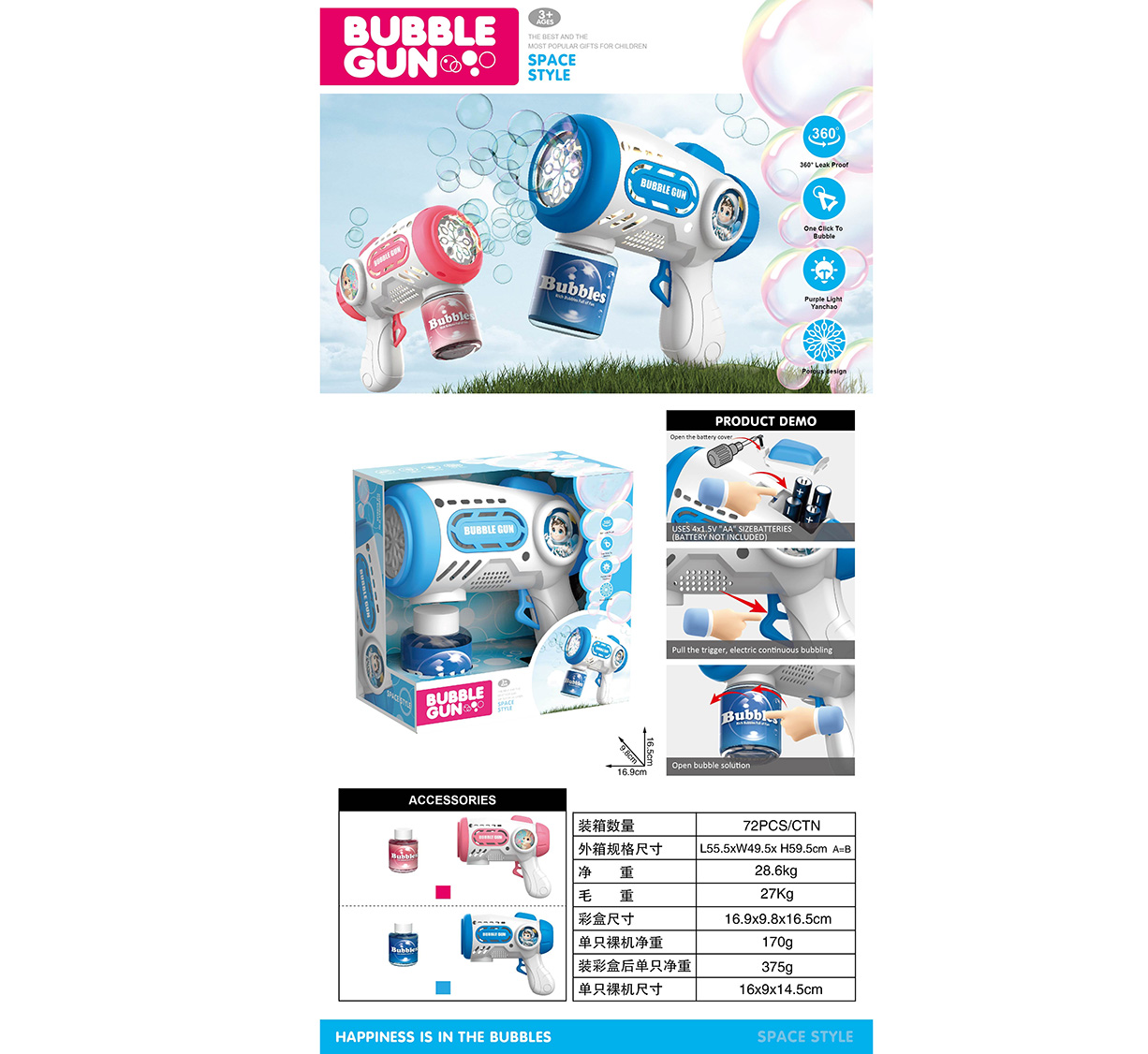 B/O Bubble gun with light (use 3*AA not inclded),85ml bubble solution ,use 85ml bubble solution,2colors
