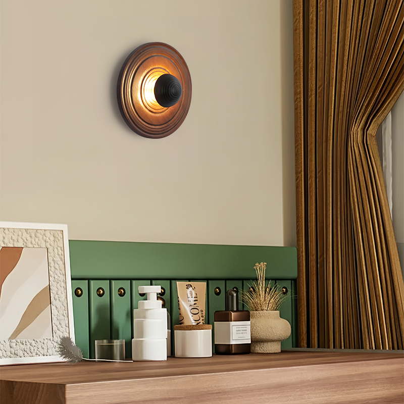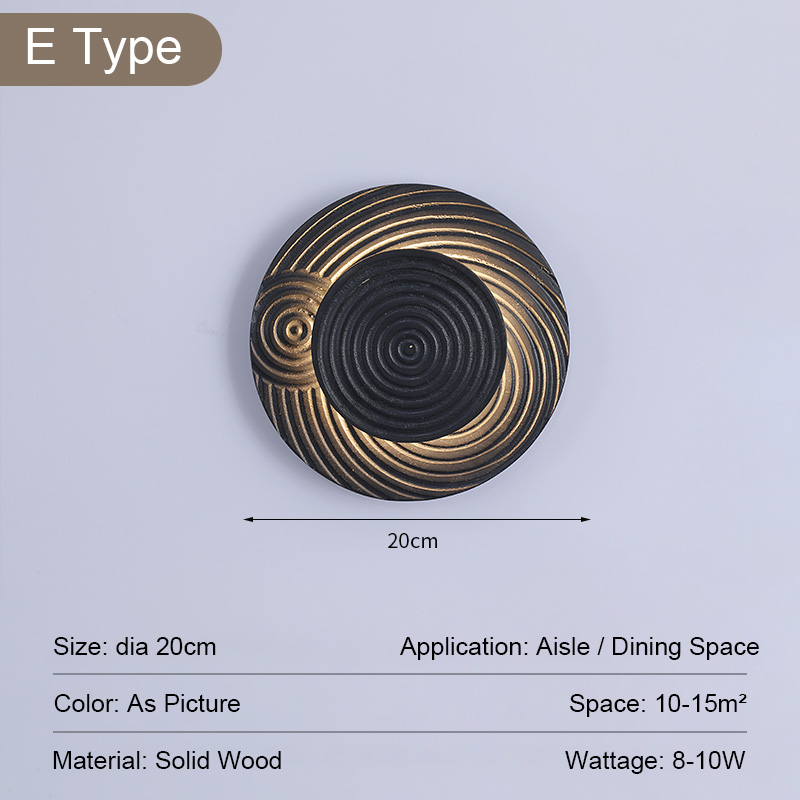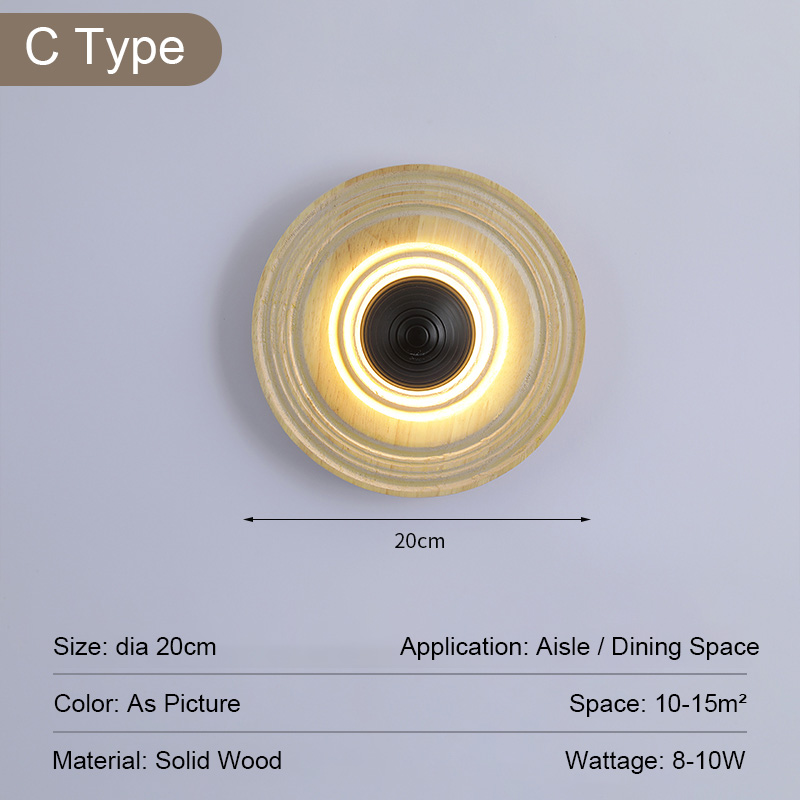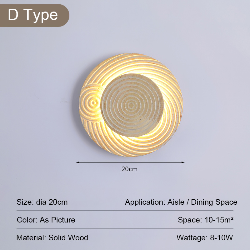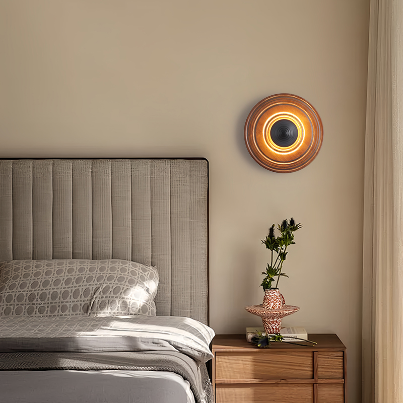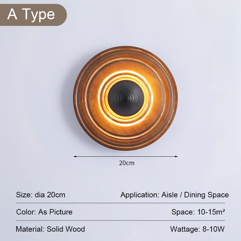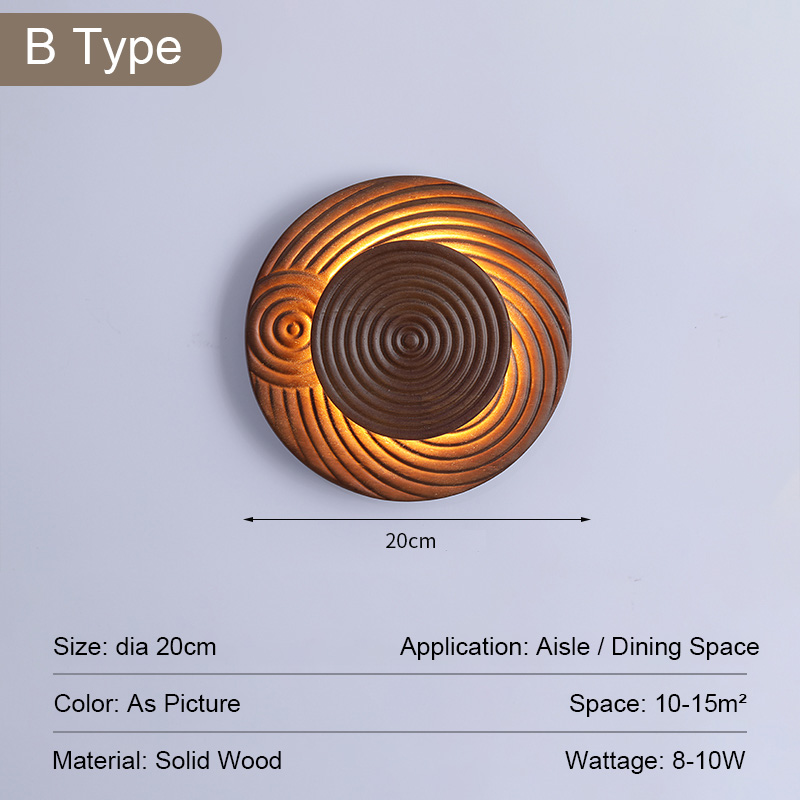 This artistic LED wall sconce features premium solid wood construction with refined concentric circular grain patterns. Available in 5 elegant finishes (walnut, cherry, maple, and black), the 20cm diameter fixture provides warm ambient lighting ideal for 10-15㎡ spaces. Moisture-resistant and crack-proof design ensures long-lasting durability.