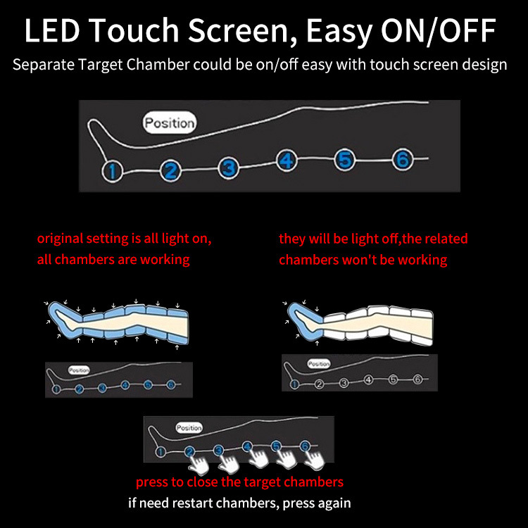 Pressure therapy is a high class lymphatic drainage and Spa natural health beauty machine in medical and beauty market. In beauty market, the compression system has a soft massage from feet to heart, and it is slimming treatment by drainage dissolved fat cells or bad deposit. In medical market, it has a sequential squeezing from distal to proximal, thus help to improve the circulation of blood and lymph, and to prevent the DVT and PE, trauma, inflammation and edema relief