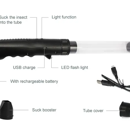 How to use: 1 First,connect USB cable to charge,normally,fully charge need two hours 2 Change the tube cover as the suck booster (as the below illustration) 3 When you find some creepy insect around you, just press the button ”IN” continuously and keep the tube directed to the insect and until they are into the tube. 3 Once insect touch the electricity grid,it produces electronic shock to kill them, then keep upright or pop on the tube cover and simply move the insect into garbage. 4 If at night, or at some dark place, you can press the button “LED” and then do as step 3 At last, please press again the button”LED”. The light will be off. 5 Suggestion:For maximum suction hold the bug vacuum at a 45 degree angle.This force will will release the bugs sticky legs from the surface it’s clinging to.