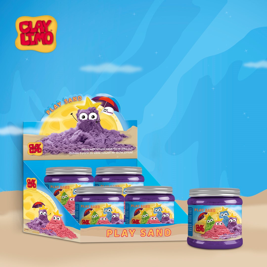 CLAYLIMO PLAY SAND 300g/10.58oz in a screwed tin plastic tub, 12 tubs packed in a counter top PDQ. Play Sand is made with natural sand! Never dries out! Squeezable, mouldable and buildable, super kinetic flow, superior quality and value, formaldehyde free, parabens free