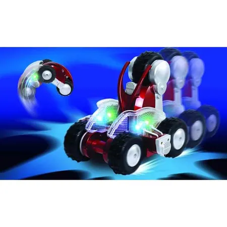 Showcased here is a remote control toy car which is battery-powered. This car can perform a range of actions, including moving in 4 directions, stopping as well as rotating 360°. The car also flashes during motion for added fun.
