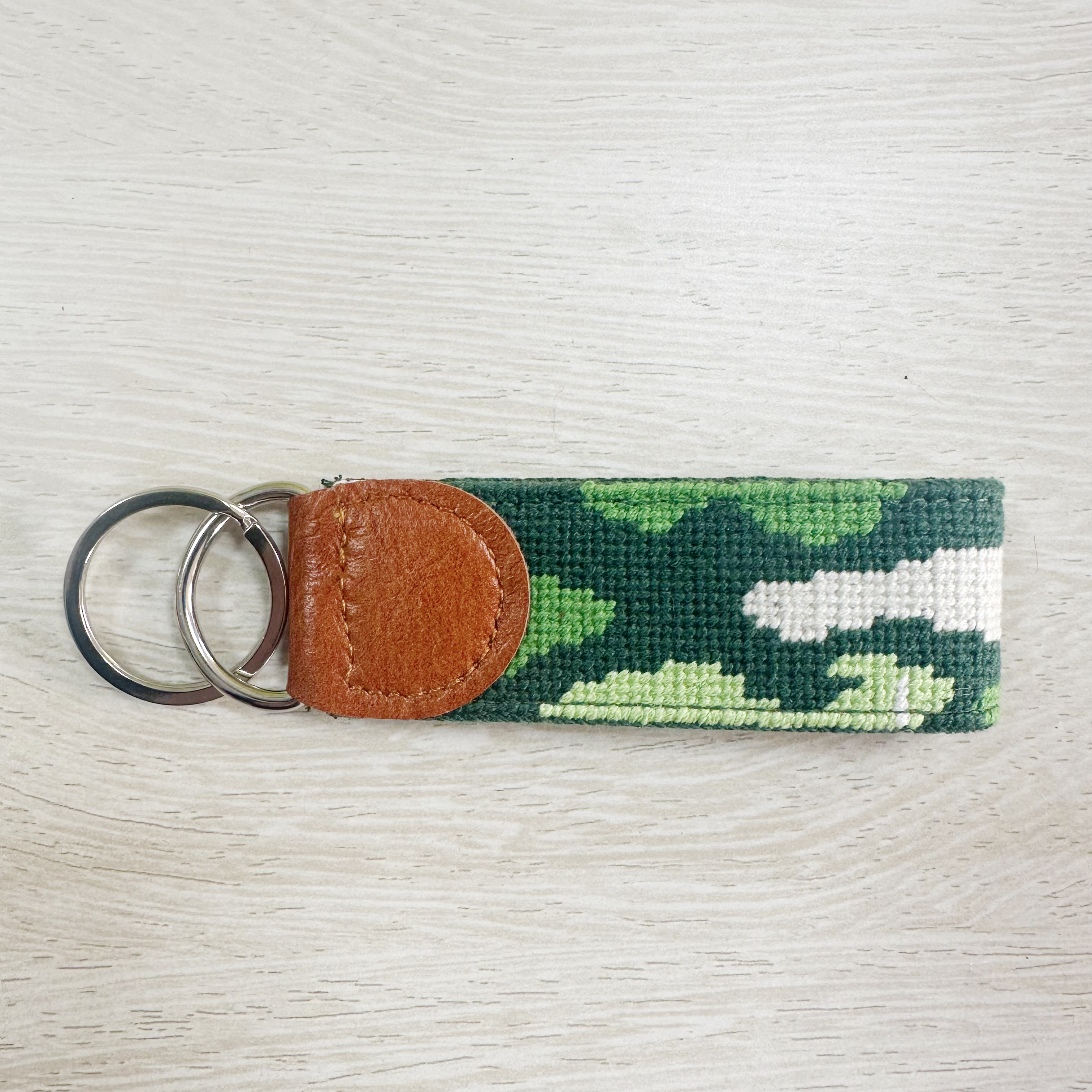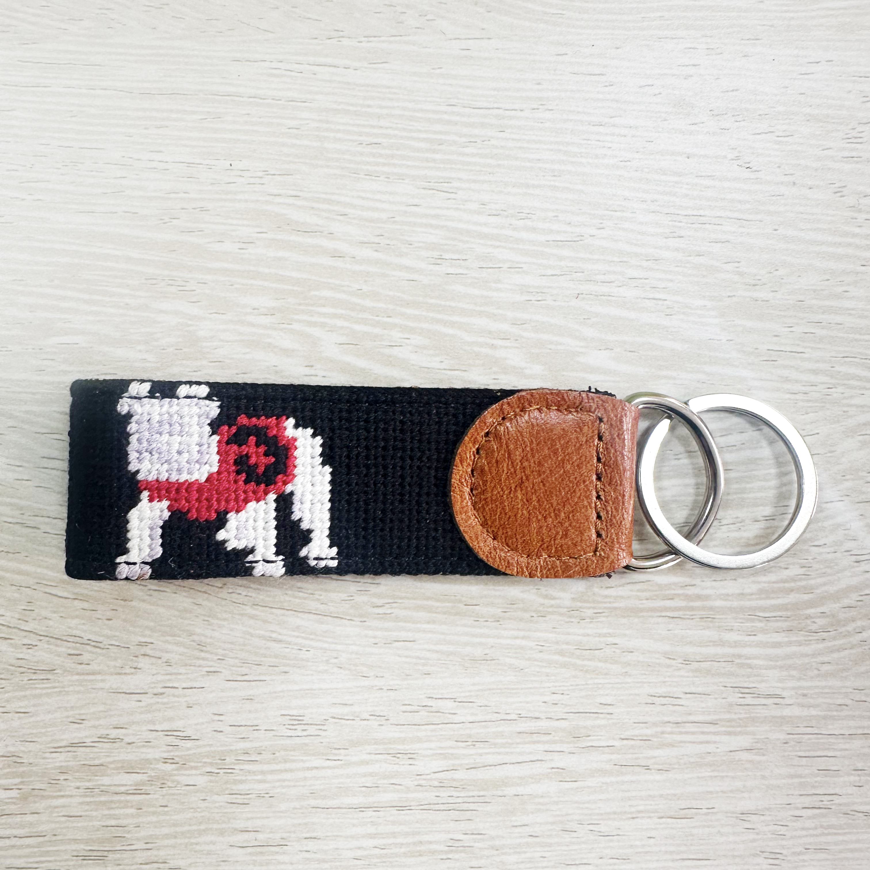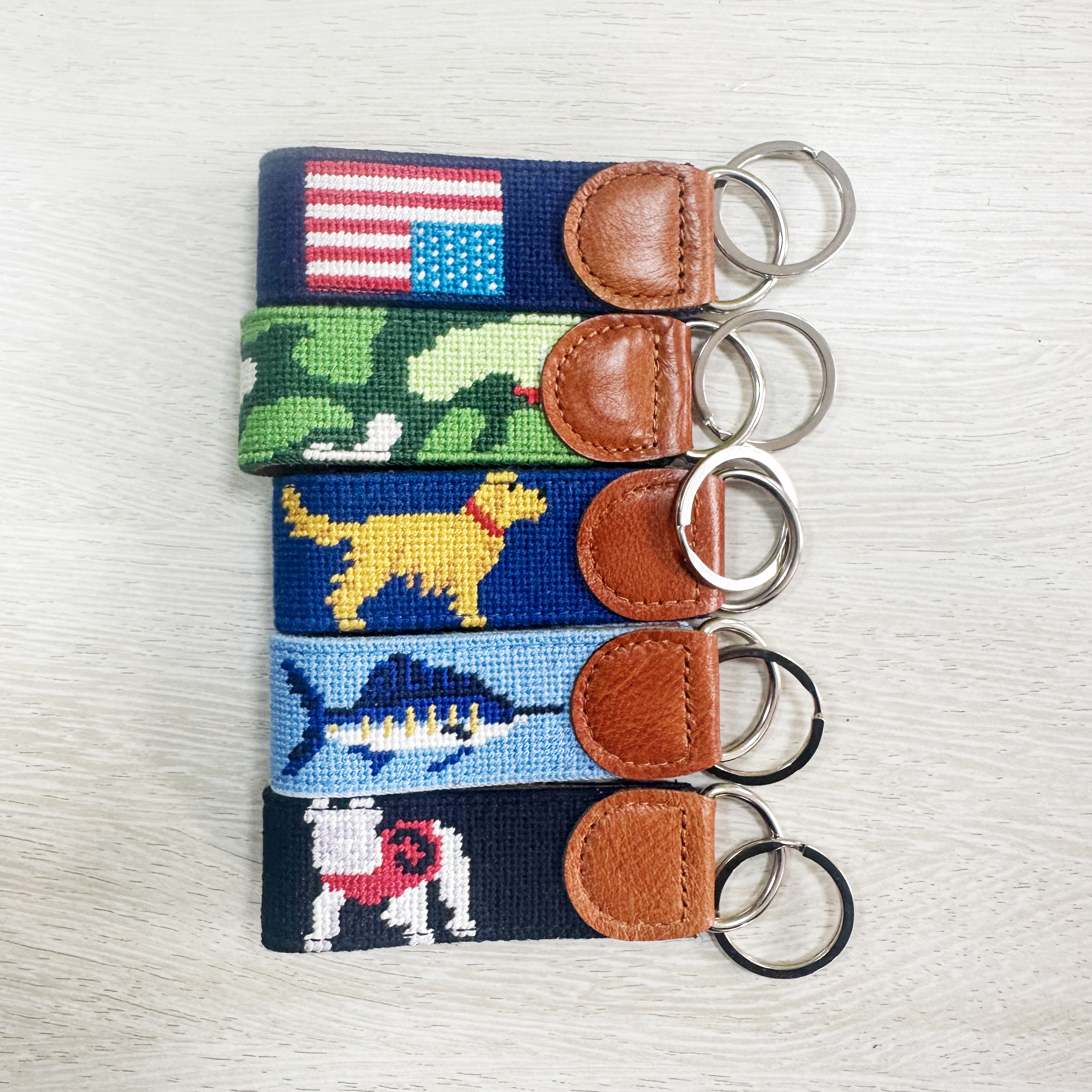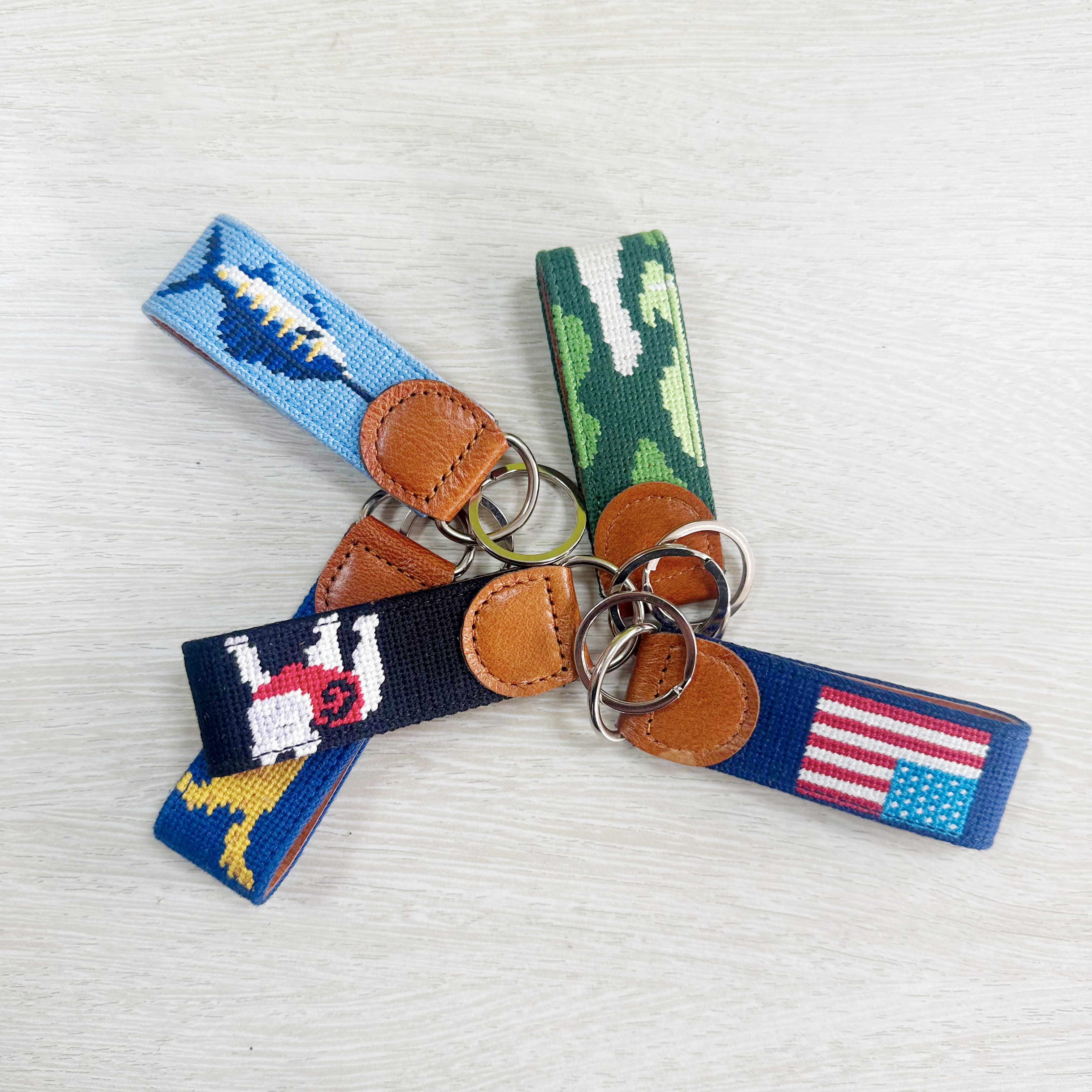 Crafted with attention to detail, this collection of needlepoint keychains blends timeless craftsmanship with modern design. Finished with genuine leather and sturdy hardware, they are designed to elevate your everyday essentials.