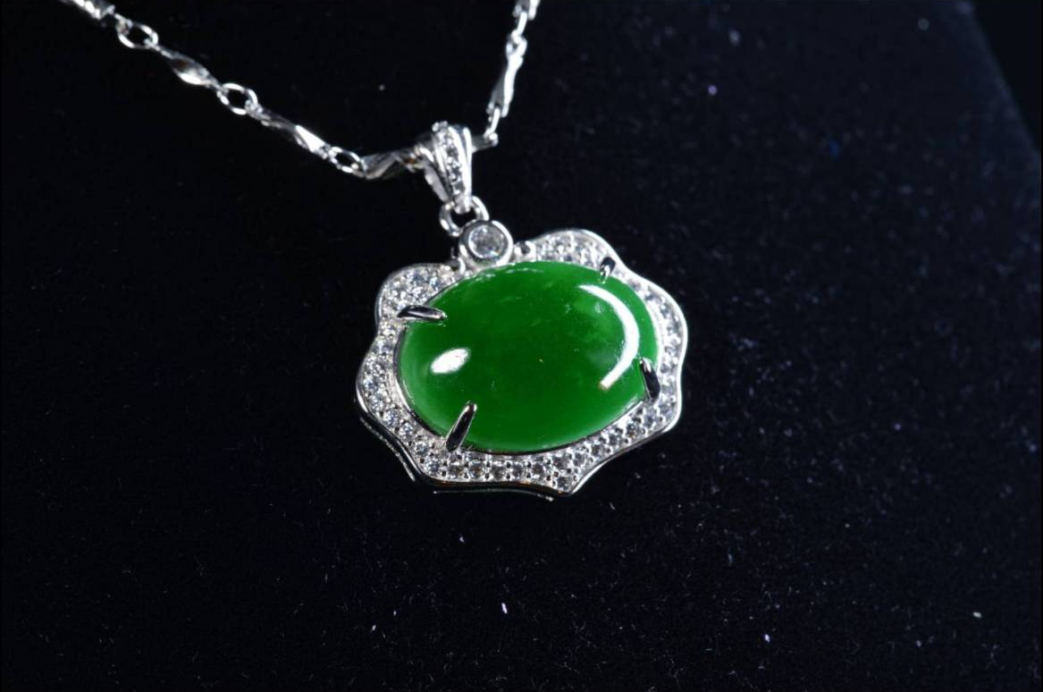 This necklace radiates a refined blend of classical and contemporary elegance. The centerpiece is a well-proportioned, highly polished jadeite cabochon in a deep emerald-green hue. Its rich color and fine texture evoke the tranquility of a clear lake, possessing a profound and serene beauty. The jadeite is encircled by a delicate halo of brilliant small gemstones, set in a beautiful floral design that enhances the main stone's subtle luster. A single, sparkling stone adorns the bail, connecting the pendant to a graceful wave-pattern chain. This piece is a stunning demonstration of the exquisite harmony between the soft glow of Eastern jadeite and the precision of Western setting artistry.