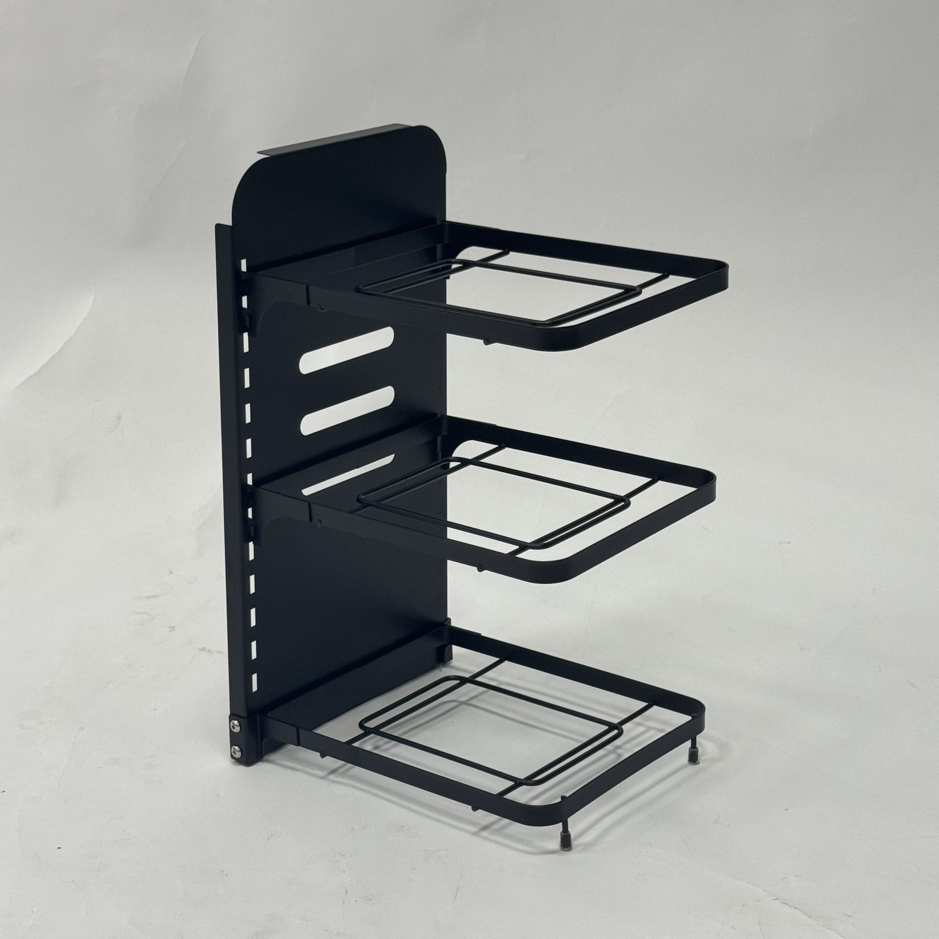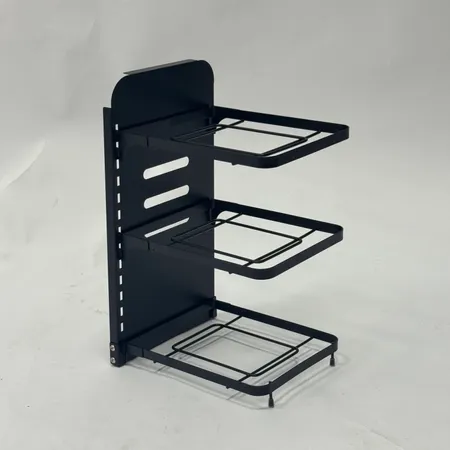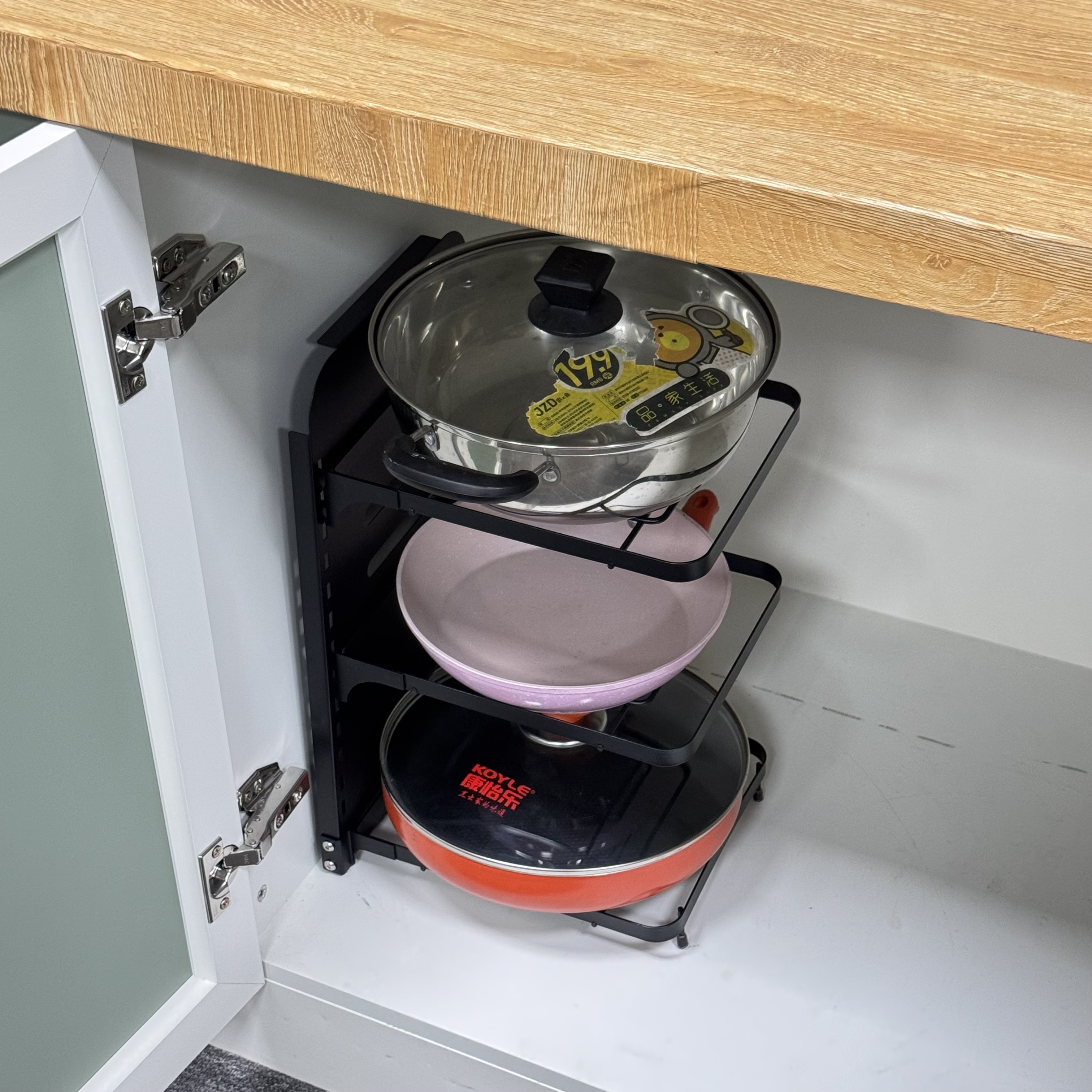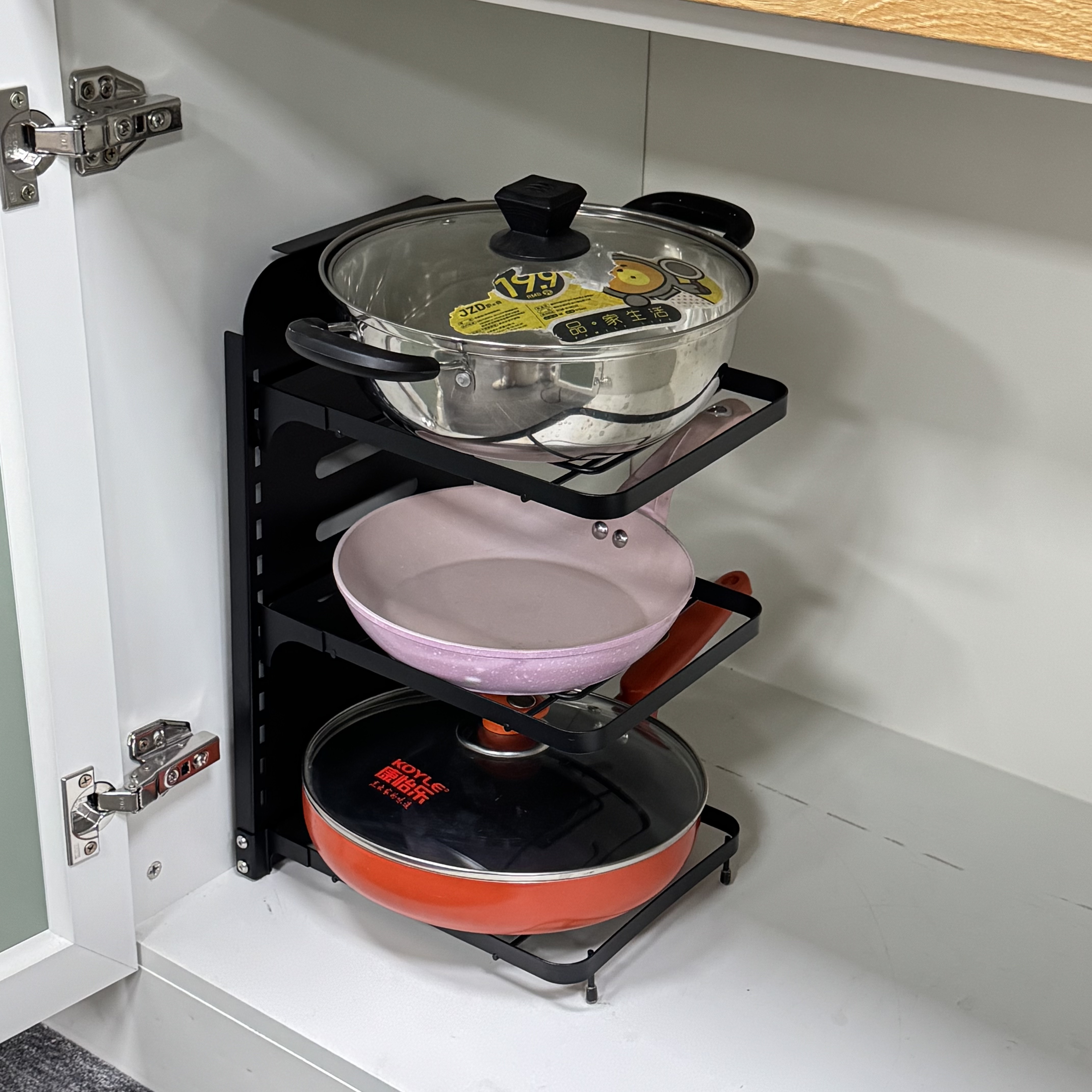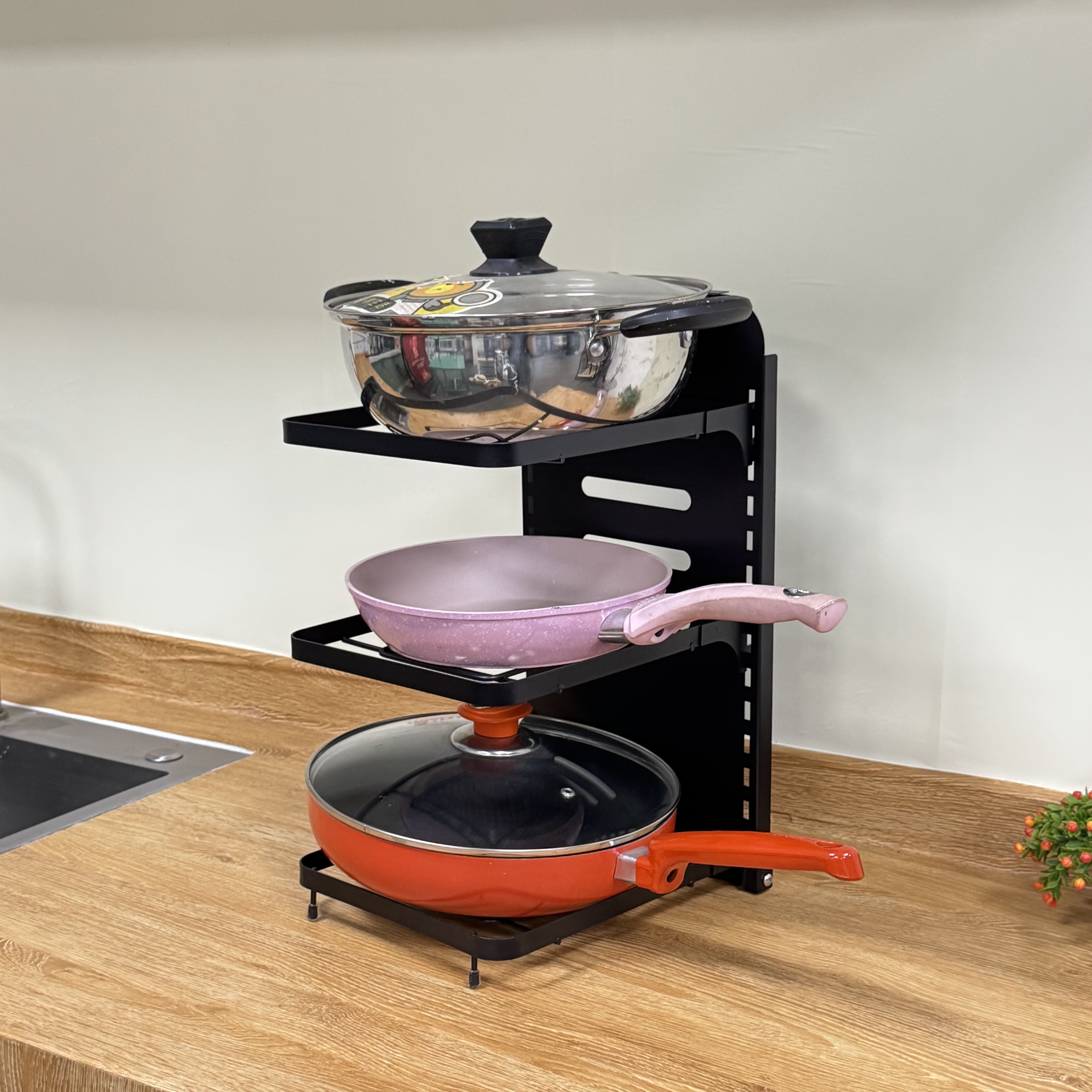 Height Adjustable Tiers: Features a unique snap-on buckle design. You can easily adjust the height of each shelf to accommodate deep stockpots or flat frying pans.