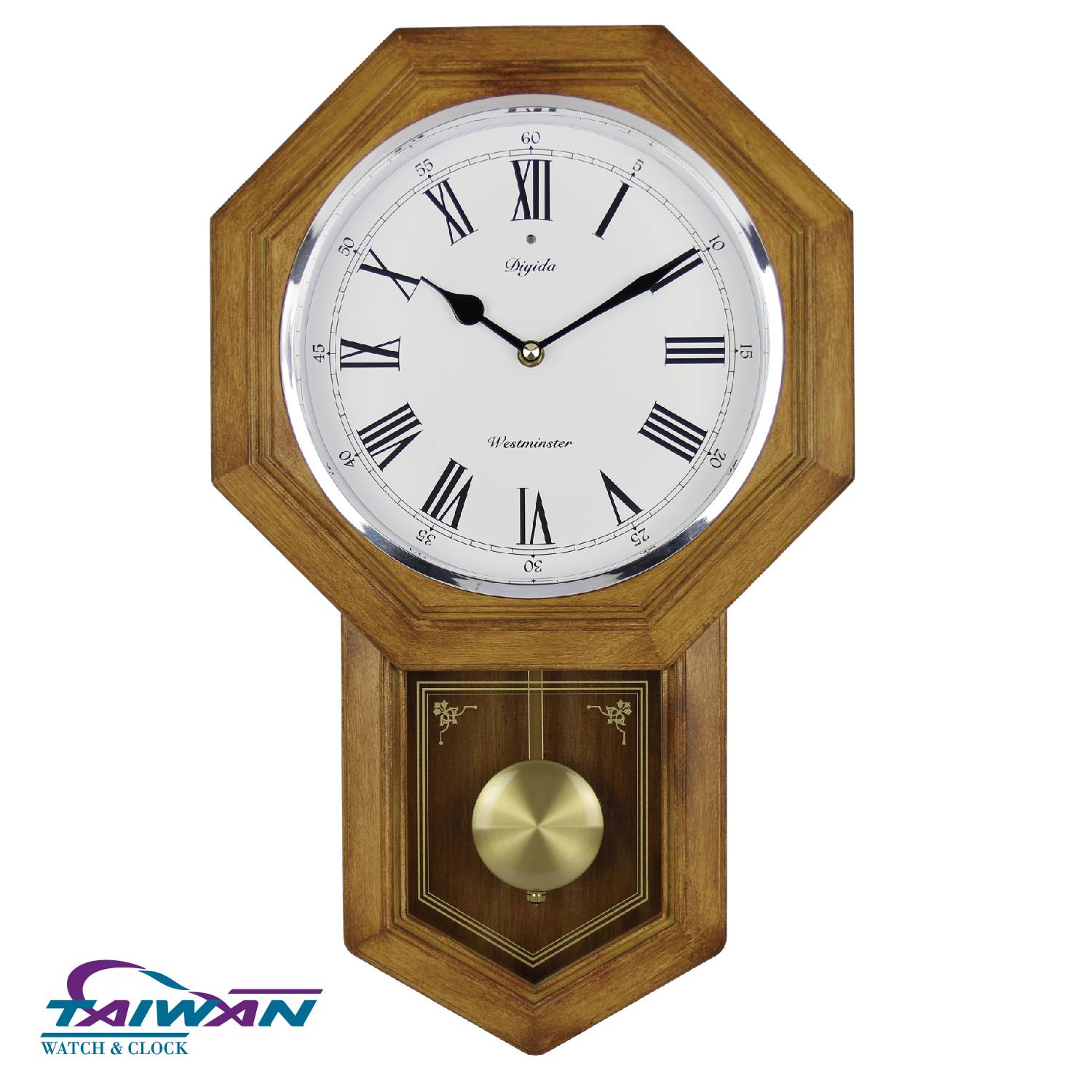 Wooden finish plastic school house pendulum clock 345mm L x 65mm W x 515mm H. Westminster chime will play every hour on hour during the day time (or when clock is in the light).