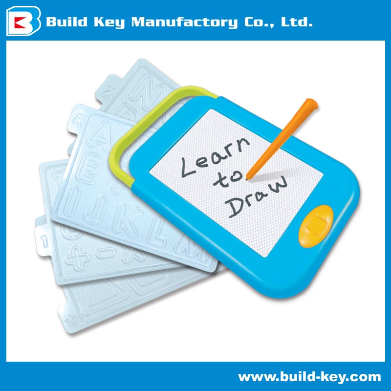 TRACE & LEARN DOODLE BOARD is a perfect drawing kit travelling with ONE easy touch erase button, 1 magnetic pen, 4 PVC stencils (letters, numbers & shapes)