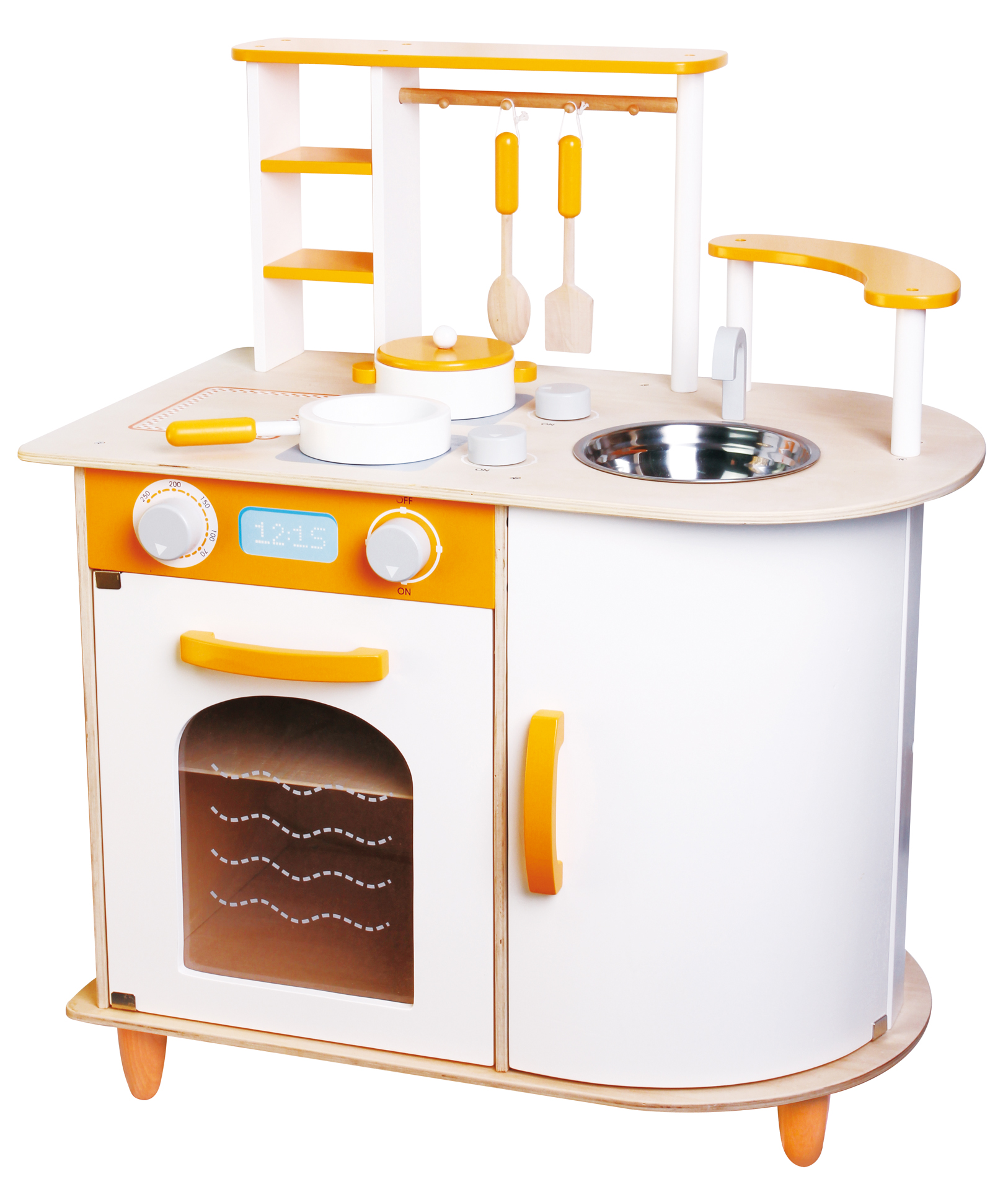 The Kitchen w 2 Cooking Utensils, 1 Pot, 1 Pan, 1 Metallic Bowl;A contemporary kitchen unit with 6 separate sections giving lots of room and space. Consisting of an Oven, Hot Plates, Sink, Storage Cupboard, Storage Shelves and Work Surface. Also included 2 Cooking Utensils and a Pot and Pan. Great play value for the budding chef when preparing a meal for friends. Encourages social skills and imaginative play.