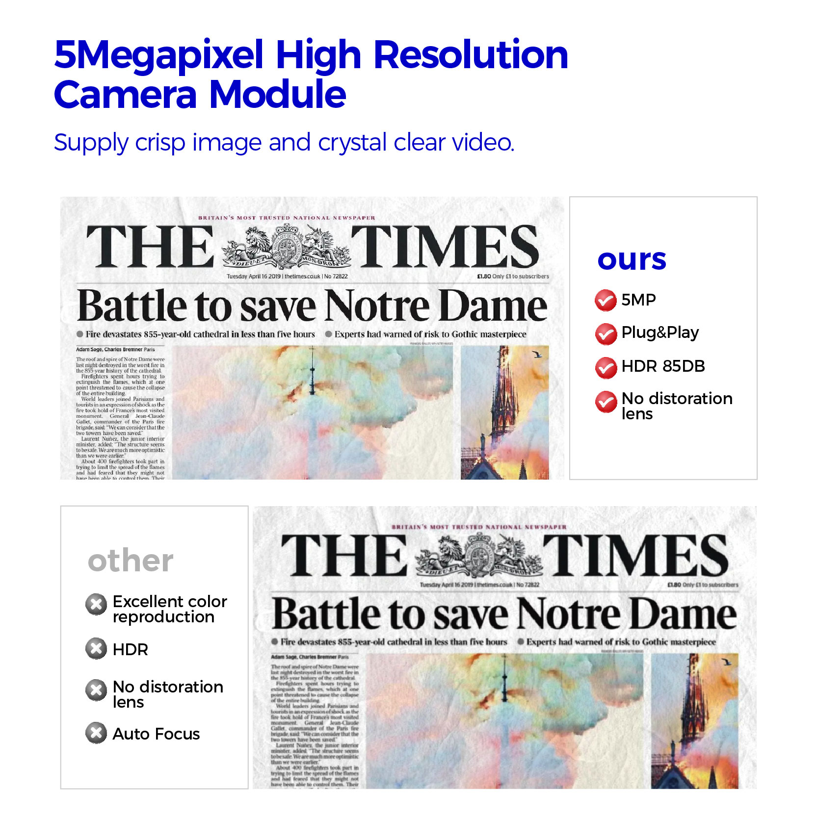 2K HD Resolution: This camera module adopt a large chip 1/2.5" PS5520 image sensor with 2.2µm*2.2µm pixel technology from ON Semiconductor. The HD 2592×1944 of resolution at 30fps has a 2K HD image. Best for face recognition, access control system, OCR reader etc.