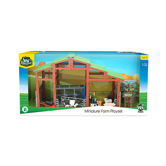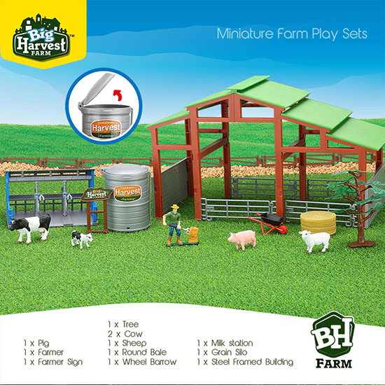 1 steel framed house, 1 milk station, 1 grain bin, 1 farm sign, 1 wheel barrow, 1 round bale, 1 tree, 2 cows, 1 pig, 1 sheep, 1 farmer