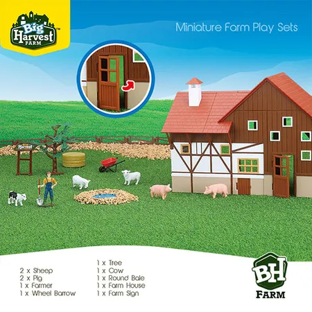 1 farm house, 1 farm sign, 1 wheel barrow, 1 tree, 1 round bale, 2 pigs, 2 sheep, 1 cow, 1 farmer