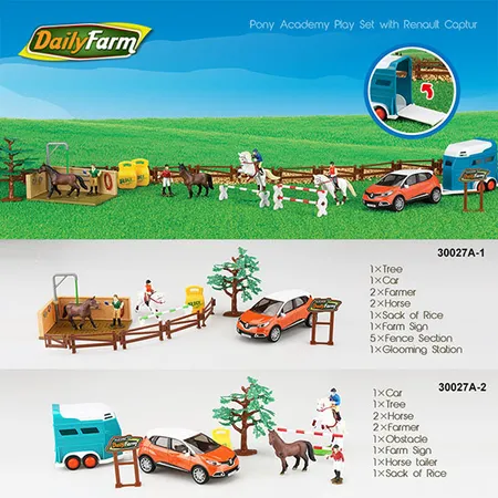 1 car, 2 farmers, 2 hourse, 1 obstacles, 1 sack of rice, 1 tree, 1 farm sign, 1 horse glooming station
