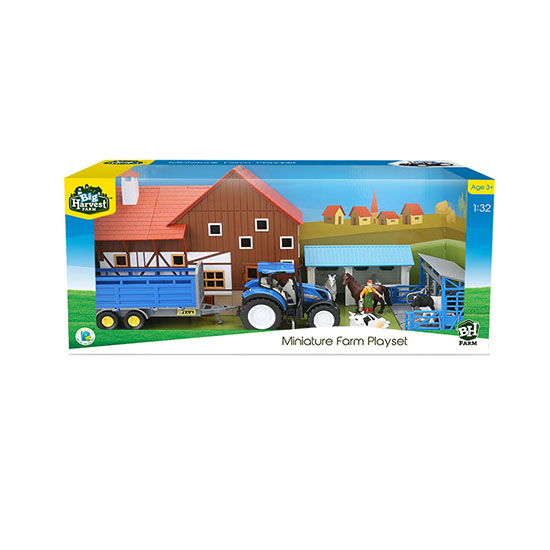 1 house, 1 horse shield, 1 milk station, 1 tractor, 1 livestock tailer, 2 horses, 1 cows, 1 farmer