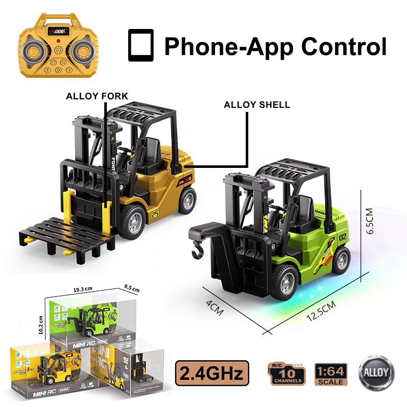 Alloy 2.4GHz 1:64 Scale Mini 10CH R/C Forklift (crane) with light and sound (Forward/Backward, Turn left/right, up/down, Three-speed switching, Sound effect swiftch, Horn, Start/Stop, Auto demo) (Yellow/Green car body and Fork is die-cast)
