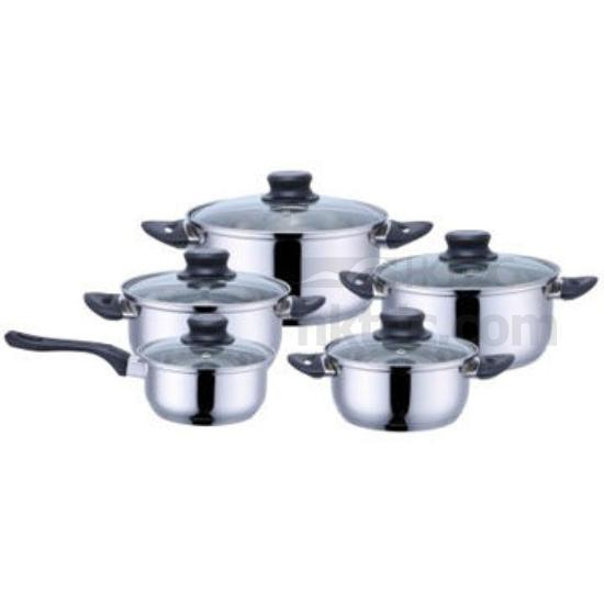 Stainless steel cookware set with saucepan, casserole and fry pan, heat-resistant bakelite handles, transparent glass lid for easy view while cooking, thick aluminum core in the bottom for good heat distribution