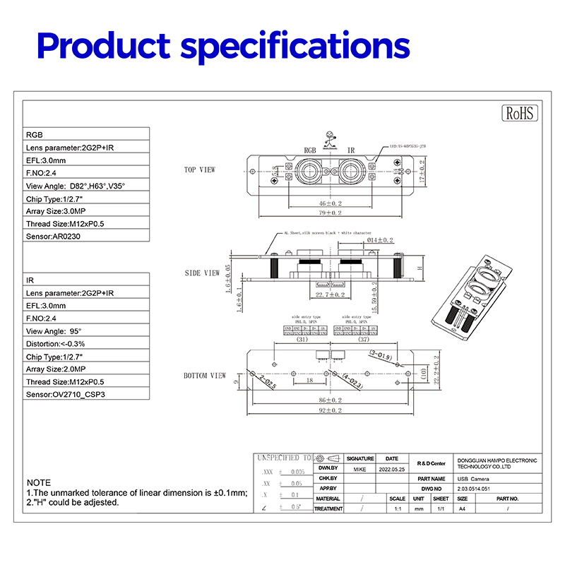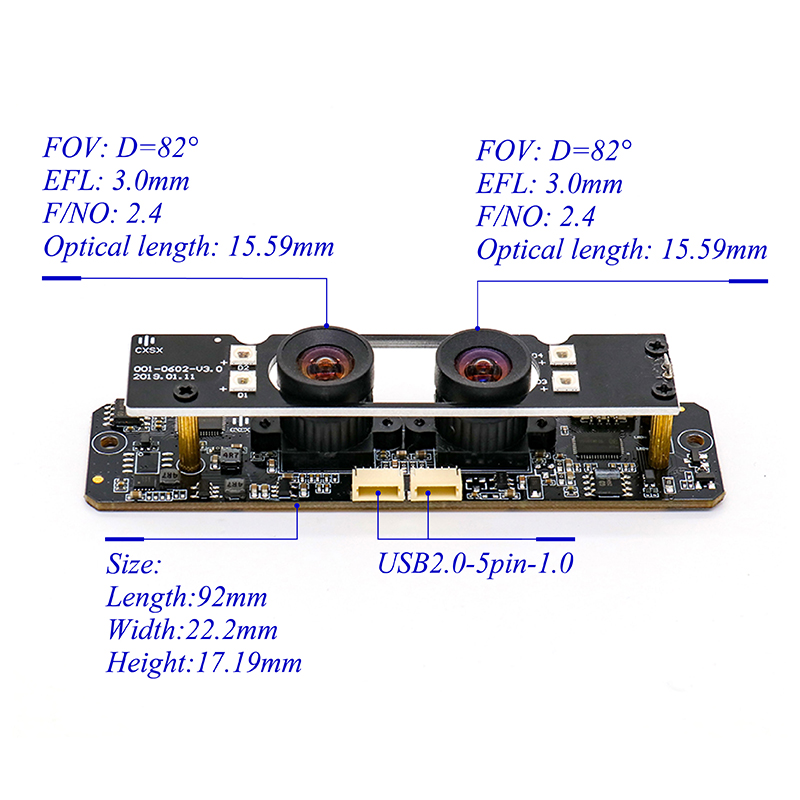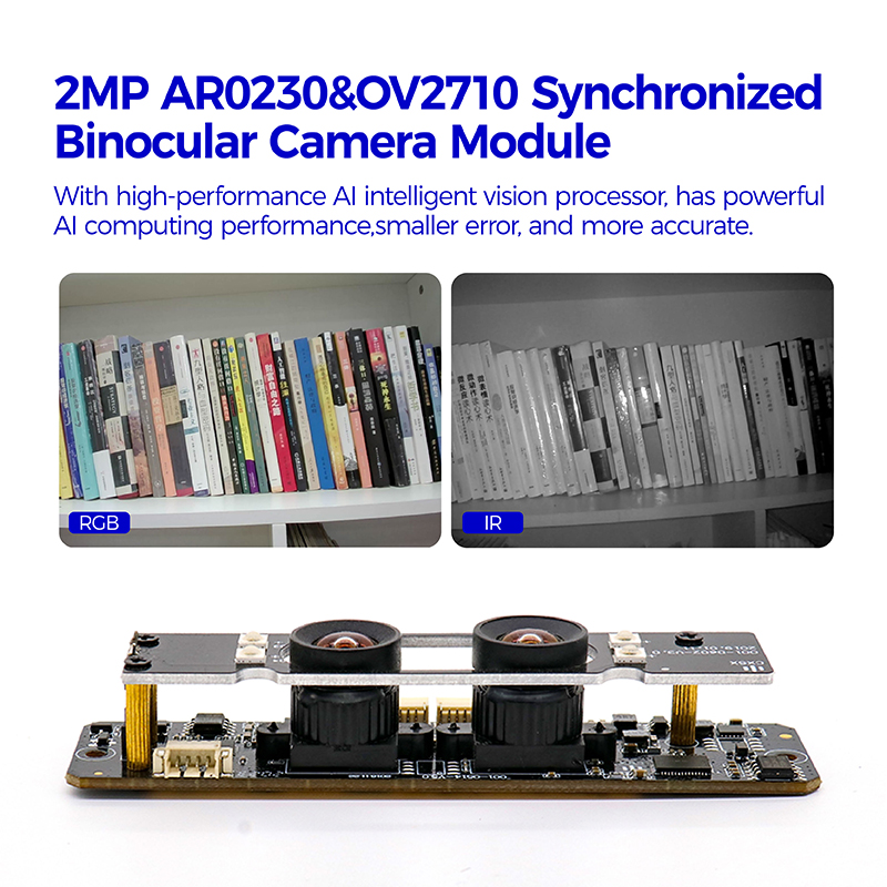 2MP camera module utilizing the disparity between the two lenses through algorithms, allow MACHINE to see the world as we do.Passive stereo vision designed for environment versatility and featuring long-range capabilities and high-resolution depth perception.Small outline 38*28mm for embedded application