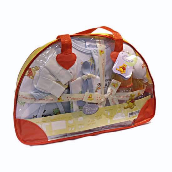 The 11-piece baby gift set includes a romper suit, a blanket, a cap, a 4oz bottle, an 8oz bottle, a bib, a tableware set, a pair of mittens, a pair of baby booties and a shoulder bag. They are well designed with good quality. This baby gift set makes a great gift for the baby shower.