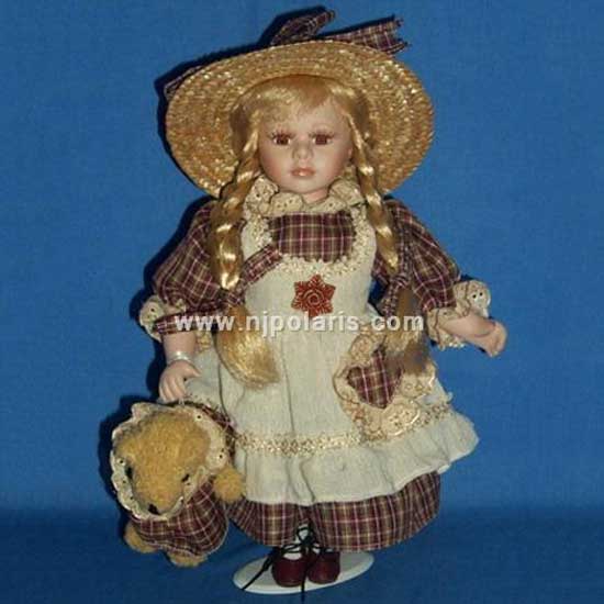 Featured here is an old-fashioned porcelain doll in country-style costumes. It is well made with exquisite craftsmanship and attention to details. This lovely porcelain doll will quickly be a favorite in any child's heart.