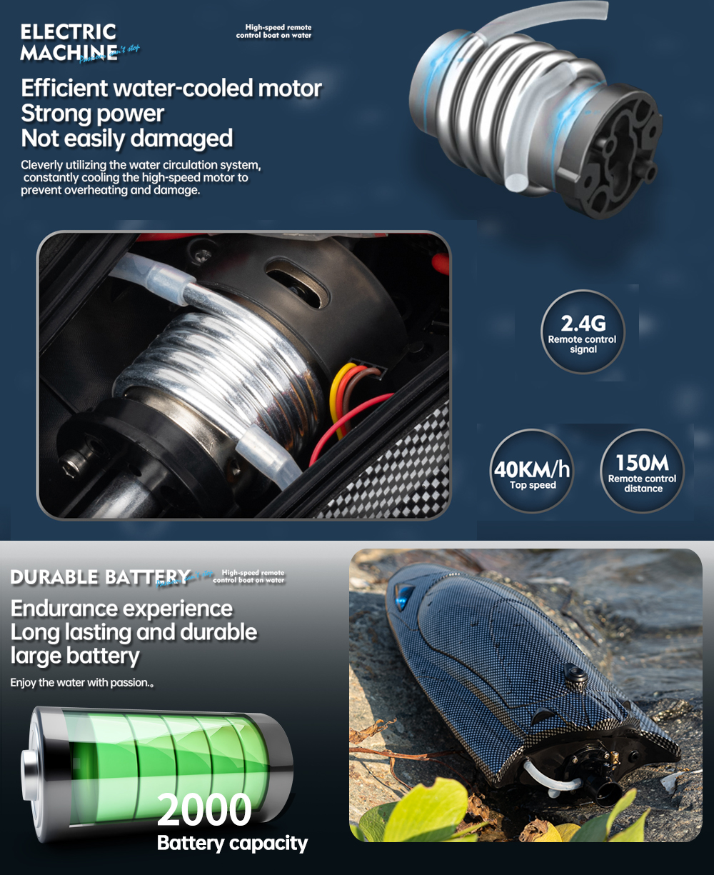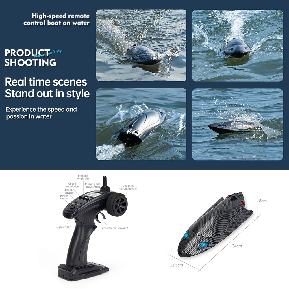 Full proportion steering gear steering adjustment, rudder size adjustment, speed adjustment, light control, one button capsize reset, over distance alarm, ship low voltage alarm, broken signal alarm, speed of about 25 kilometers (km)/ hour