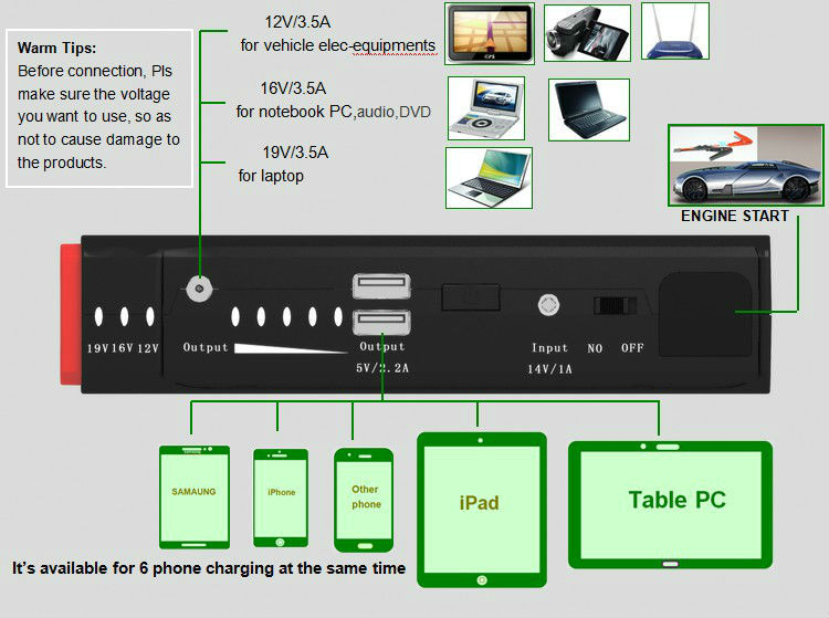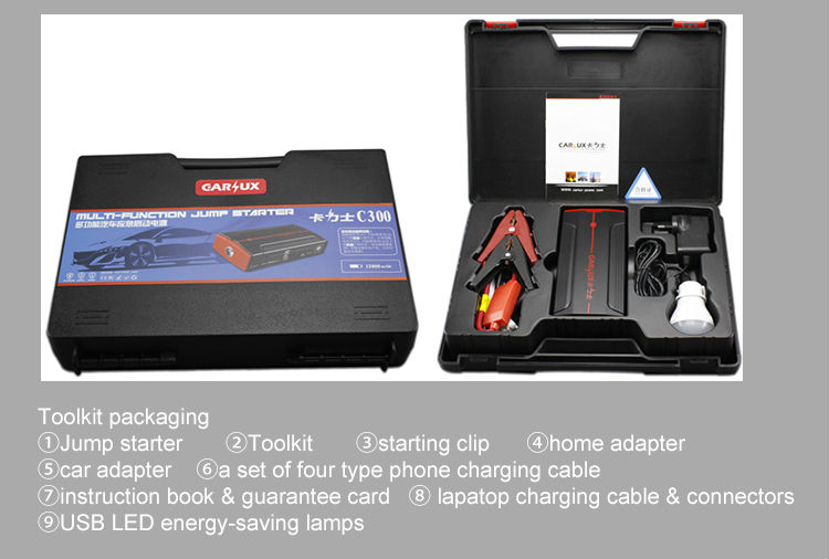 1.Charging for mobile phones and laptops, starting cars, adjustable LED lights (torch, strobe lights and SOS lights).