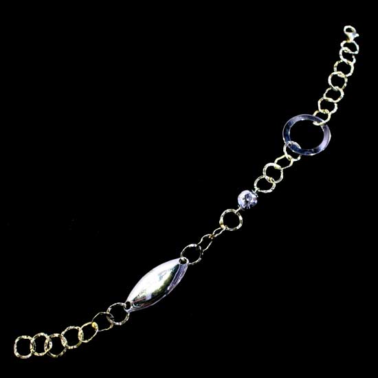 The fabulous 14K white gold bracelet features shiny silvery charms in marquise, round and hoop forms across the pale golden links. The wonderful charms glitter with intensity variation and the unfettered design perfectly expresses your unconventional personality.