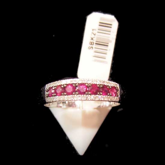 This beautiful 14k gold diamond ring is decorated with a row of red sparkling stones. The design is classic and pleasing to the eye. It can be worn with many different dresses for an elegant, sophisticated look.