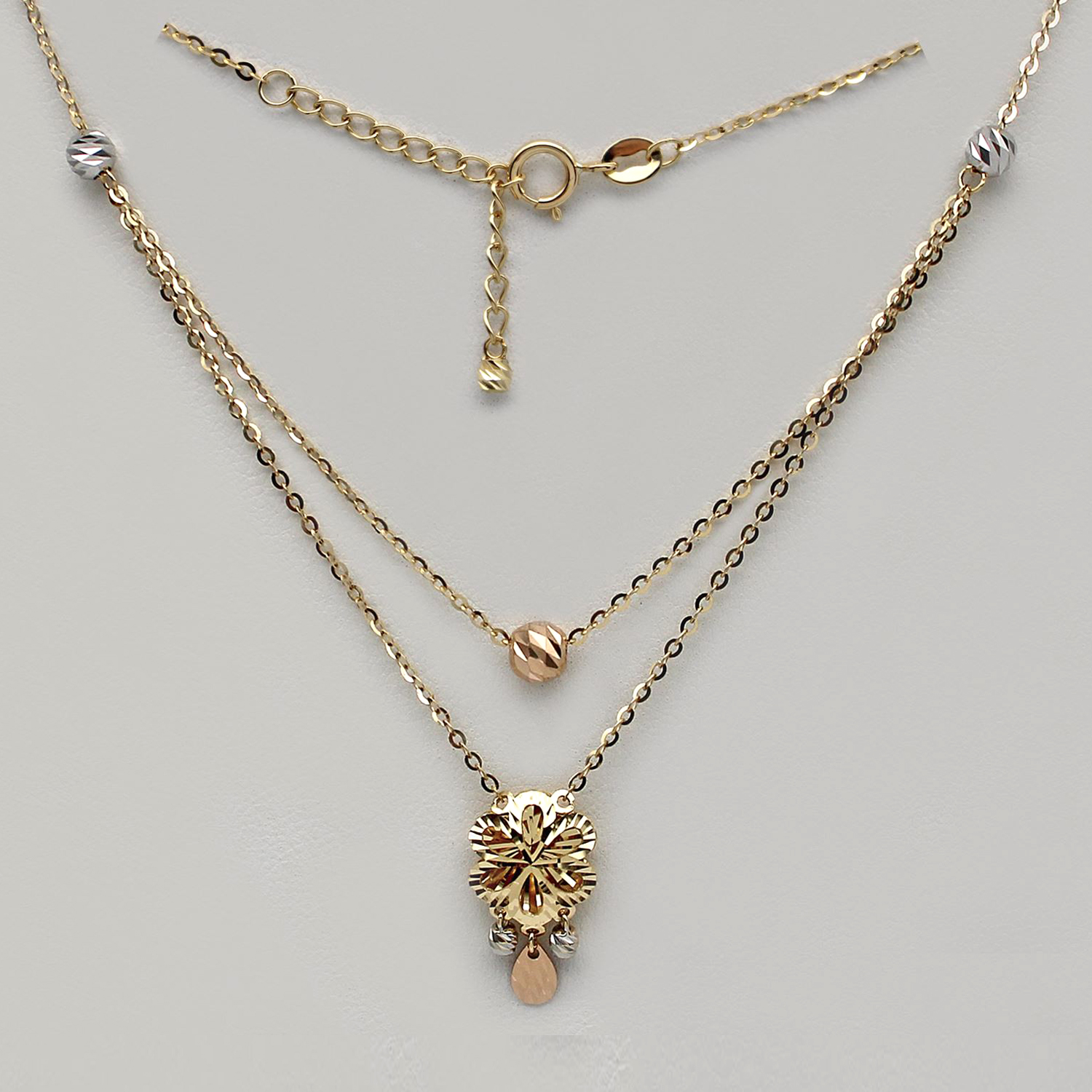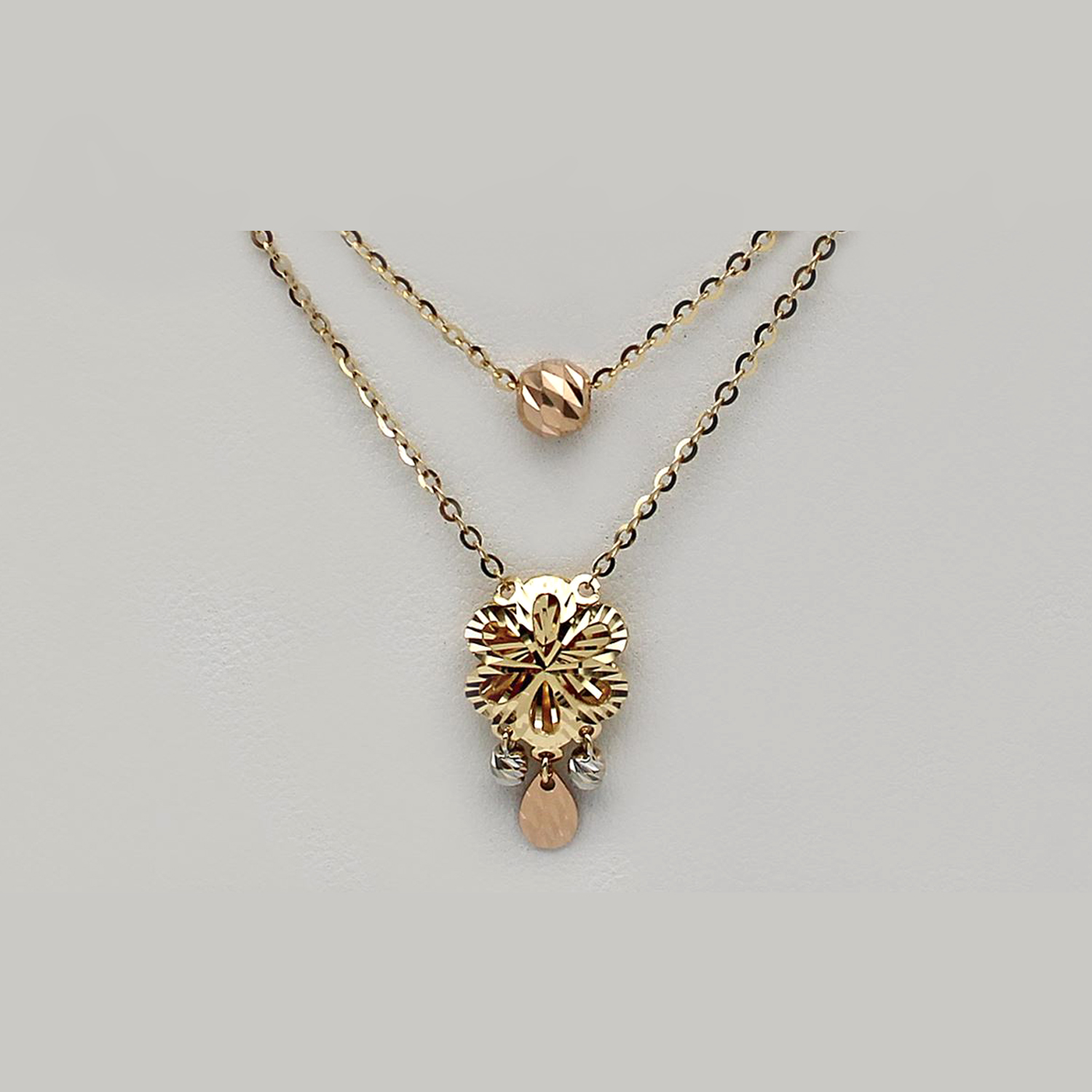 A piece of yellow gold chain hanging with 3 colors elements in the middle, and a yellow color sparkling ball is also hanging at the bottom.