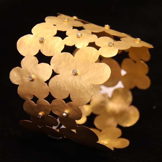 The ravishing ladies' gold bangle is exquisitely crafted with 18K yellow gold. The meticulously sculpted floral shapes bring out a sense of elegance while showcasing extensive handmade details. This dainty handmade gold bangle is sure to be the most deserving piece of jewelry to be appreciated.