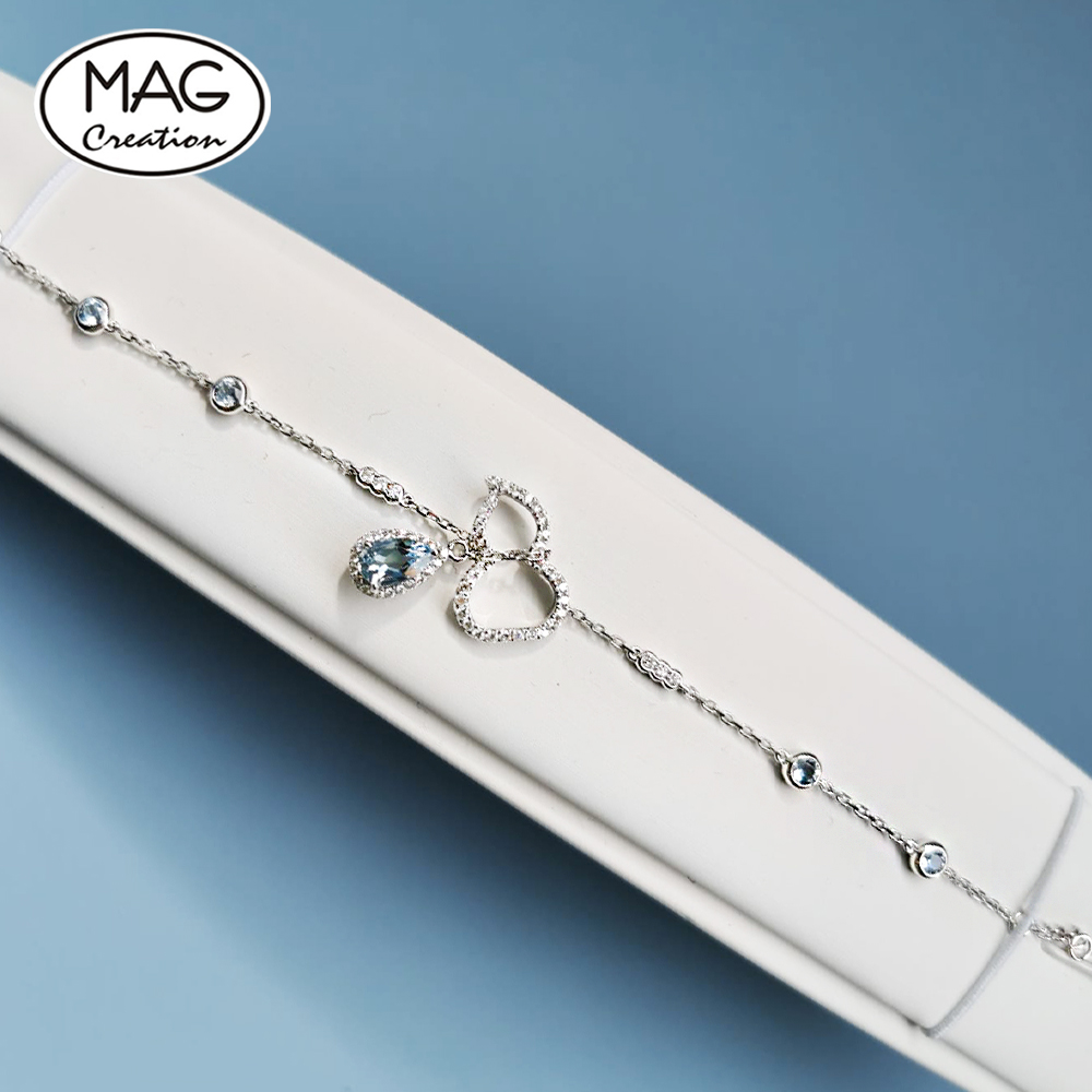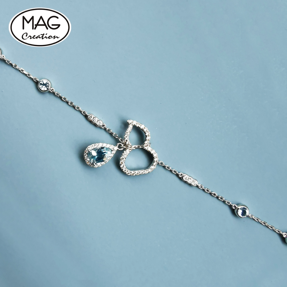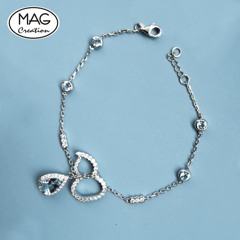 18K White Gold w/ Blessing Hulu with butterflies Natural Diamond bracelet with dangling Pear Cut Aquamarine