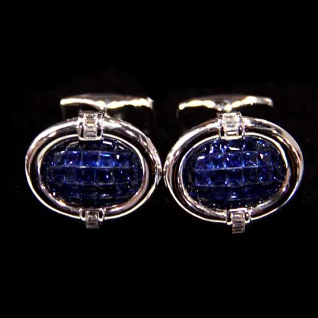 These cufflinks are stylishly crafted with sophisticated details. They boast a polished 18K gold frame set with blue sapphire stones and diamonds, showcasing a touch of uniqueness. These cufflinks are perfect for everyday wear.