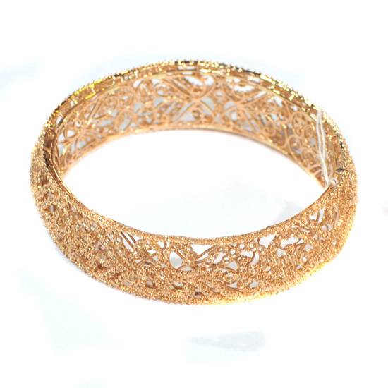 This is a 18k rose gold and diamond bangle for ladies and women. The convex bangle has a delicate openwork botanical design mounted with numerous small diamonds to create a classical and elegant style, which every lady and woman will surely fall in love with.