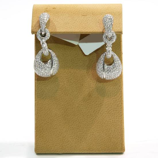 This is a pair of 18K white gold diamond earrings for ladies and women. The whole drop earrings are set with numerous round brilliant diamonds in micro pave setting. The sparkling and glamorous appearance will certainly make every lady fall in love with it.
