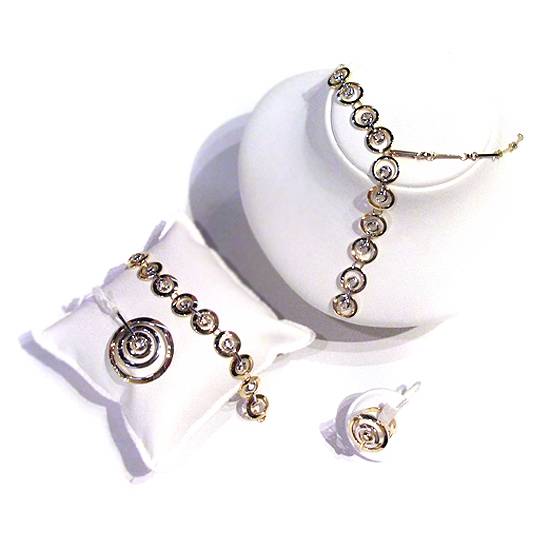 This is a set of 18K (750) gold jewellery for ladies. The set consists of a Y-drop necklace, a bracelet, a pendant and a ring. The set features a concentric circle pattern, which is fashionable and also easy-to-match in style.