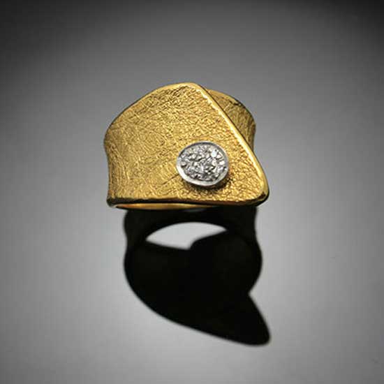 This finely shaped 18K gold ring has a unique handmade scratched surface. Decorated with an extra piece of white gold with diamonds, this timeless jewelry is sure to offer you class and elegance. This gorgeous gold ring is great for grand occasions.